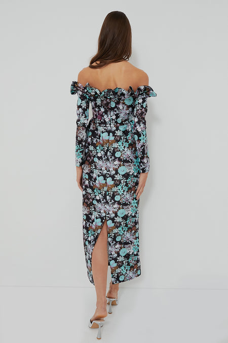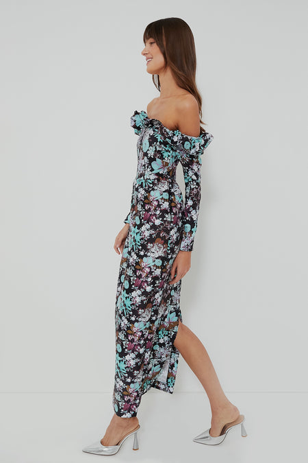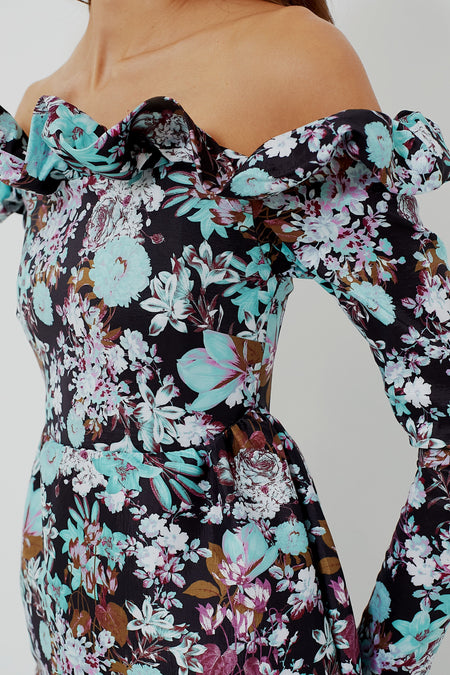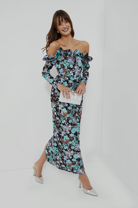 Step out in style in the Mint Lillies Enya Dress. Boasting a beautiful floral design, this maxi features a ruffled off-the-shoulder neckline with long sleeves that is sure to turn heads at every event from al fresco weddings to romantic vacation getaways. Style with simple heels and a clutch for an outfit that is sure to wow!