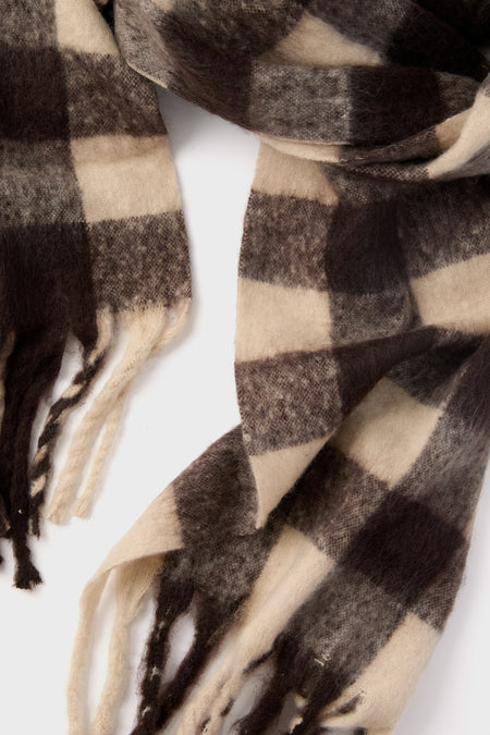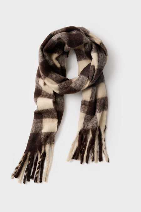 The Mocha Plaid Pattern Scarf comes in a neutral color way, with a fringe detail at the trim, perfect for dressing up a sweater dress or wearing on errands around town, this ultra-soft accessory is a must-have for the cold months.