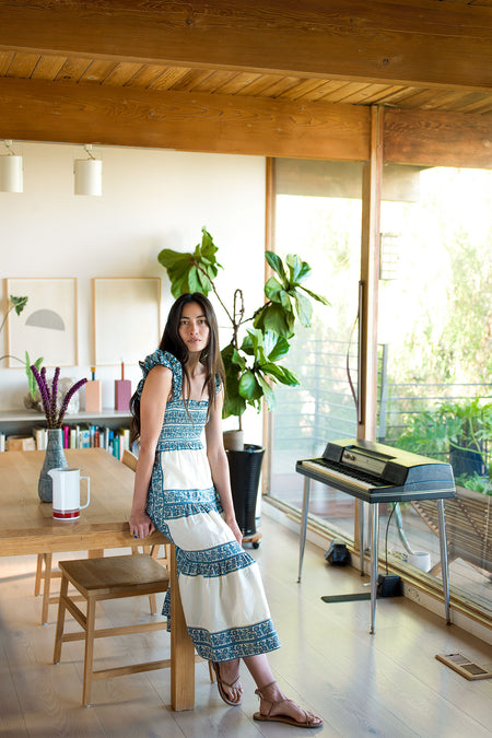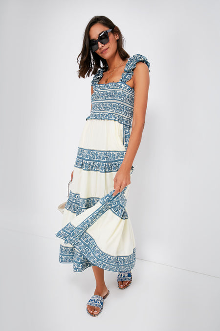Give off boho babe vibes in the Multi Arlo Print Dress. A classic silhouette with charming updates, this midi with a square neckline and smocked bodice is elevated by the addition of ruched shoulder straps and lace insets in a stunning blue hue. Take this easy breezy number with you on vacation, then add sandals and sunglasses for sipping a refreshing drink out of a coconut or add espadrilles and a clutch for dinner al fresco.