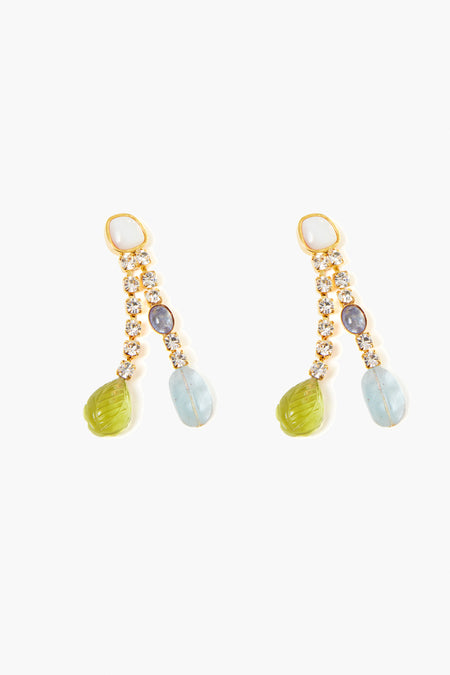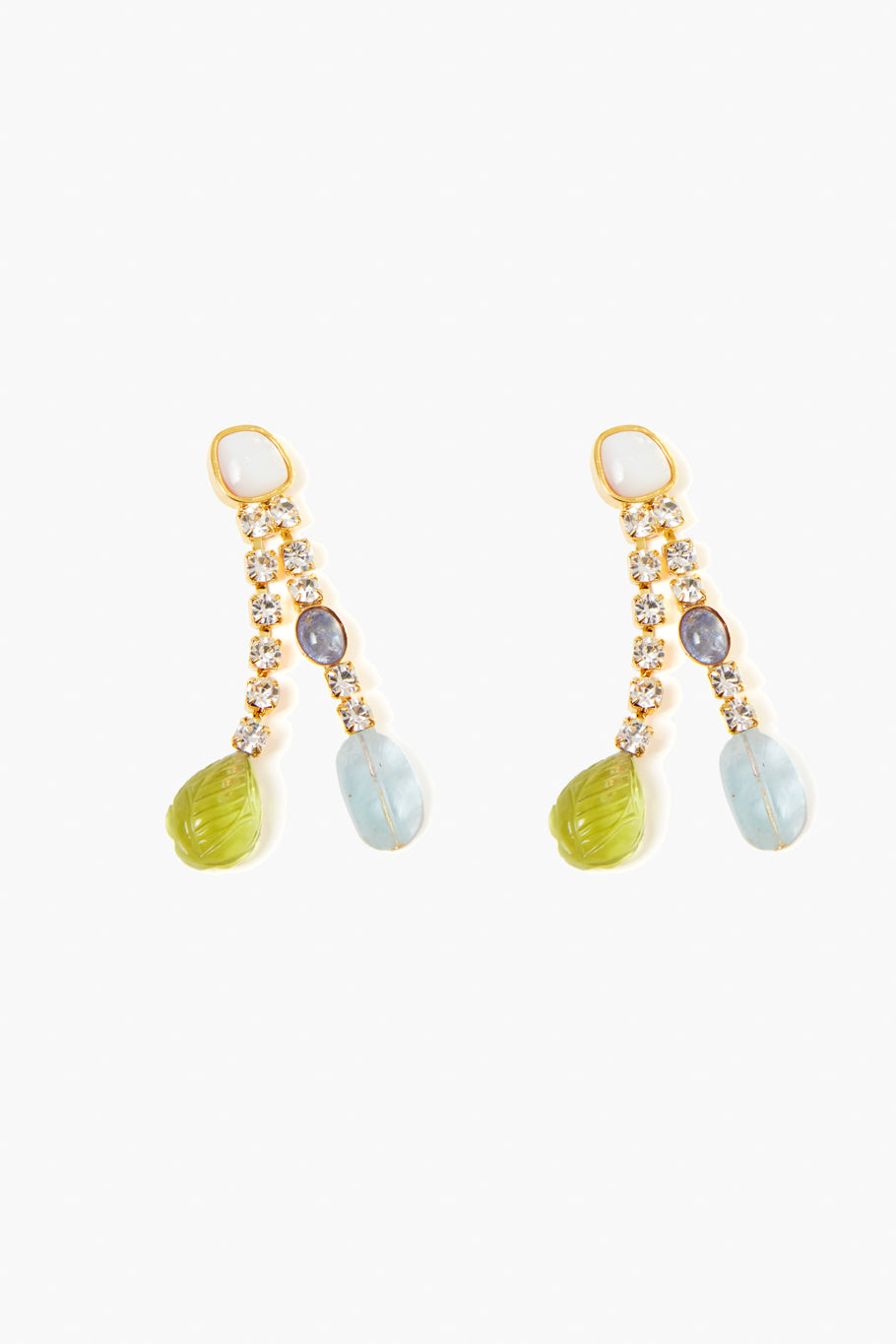 The Multi Crystal Orchid Earrings are made from gold-plated brass and rhinestone chain, with mother-of-pearl tops, hanging tanzanite, carved aquamarine, and peridot-colored quartz drops. These sparkling statement earrings are sure to add a pop to any outfit.