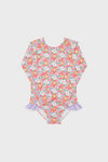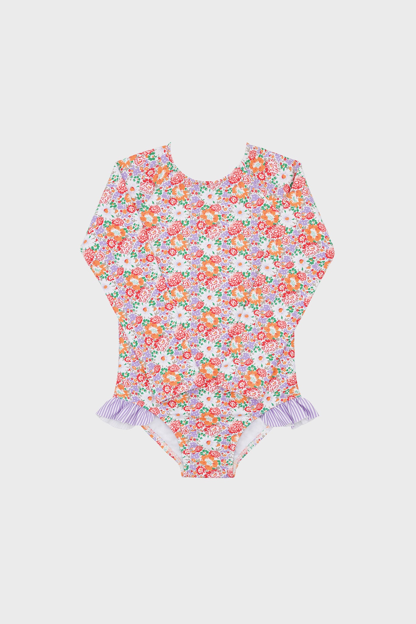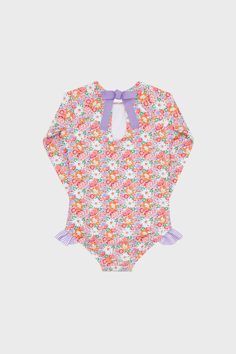 The Multi Floral Rashguard One Piece, is a sun-safe one piece for your little one! The chic grosgrain ribbon back tie is fixed with a hidden button closure for easy changes. The feminine ruffle hip detail makes this comfortable staple oh-so sweet, perfect for all day wear!