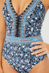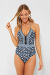 Make a pool-side statement in the Multi Maria One Piece by Sea New York. This sleek style includes a tie halter neckline, front bodice ruching detail, and blue and black floral detailing. This is an elegant one piece that will make you the Belle of the Beach- pair with a sarong, sandals, and sun hat for a stylish look.