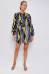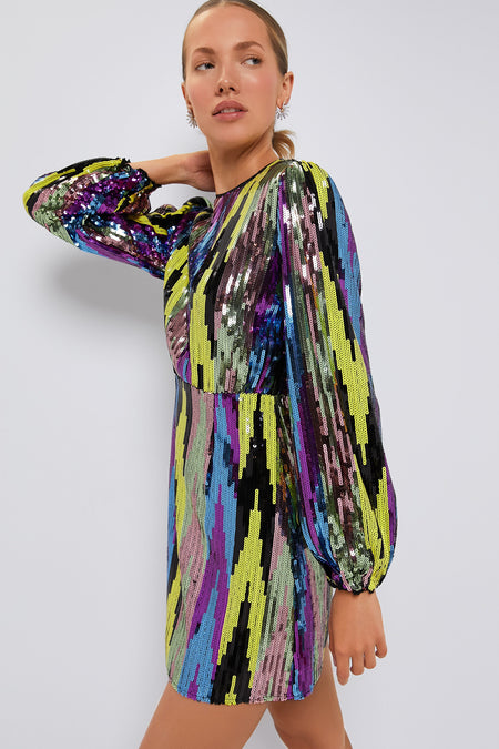 Simple in silhouette with a mock neckline and long blouson sleeves, this Multi Sequin Lola Dress, adorned with vibrant sequin fabric is exciting and gorgeous. Pair with bright heels and colorful jewelry for a rainbow look, or let the dress shine with simple heels and clutch.