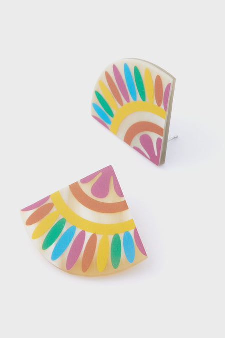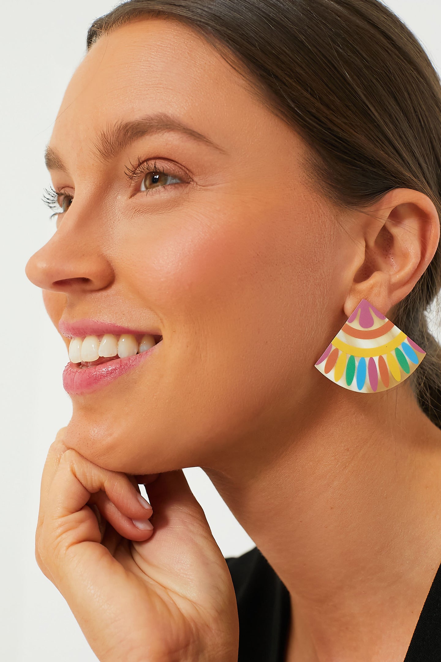 Inspired by the talavera tiles in Mexico, the Multi Spanish Earrings are hand-painted in various shades upon natural buffalo horn with a fan-shaped silhouette that adds a touch of whimsy to any look. These lovely studs will become your new favorite summer accessory with their vibrant shades and unique vibe, so pair with your favorite sundress, kimono, or skirt for a boho-chic look.