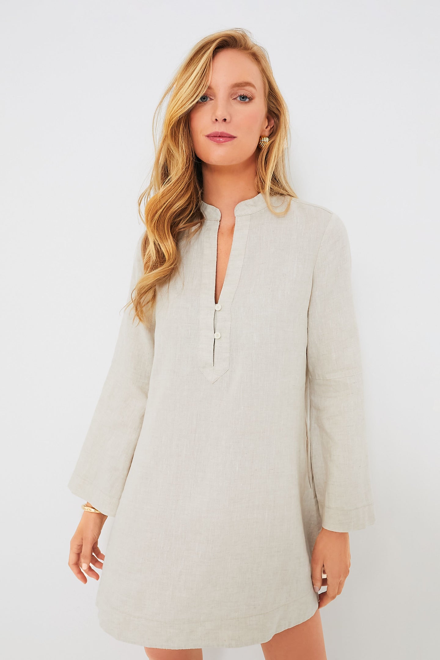 An easy, timeless classic, the Natural Linen Tatum Dress is a spring summer staple that can do it all. Crafted from luxe linen, this shift mini features a notched neckline with elegant buttons on the placket, long sleeves, curved hem providing a little swing Pair with sandals and a crossbody for a lunch date, or with raffia accessories and sunnies for exploring a new town.