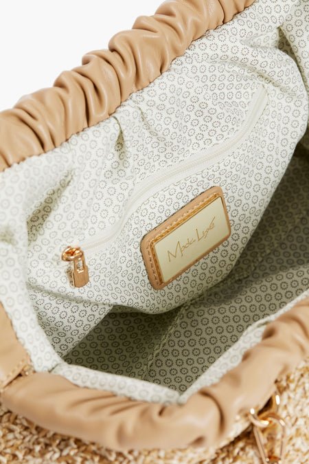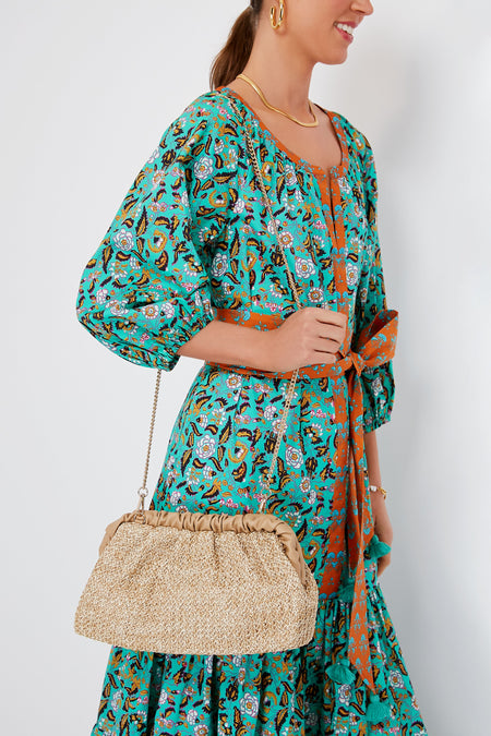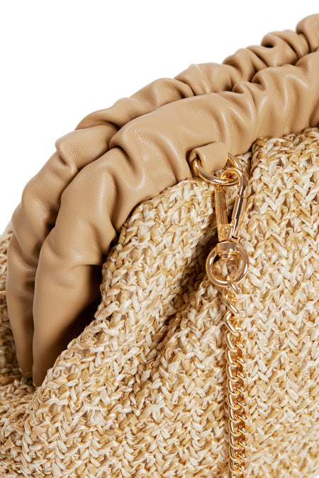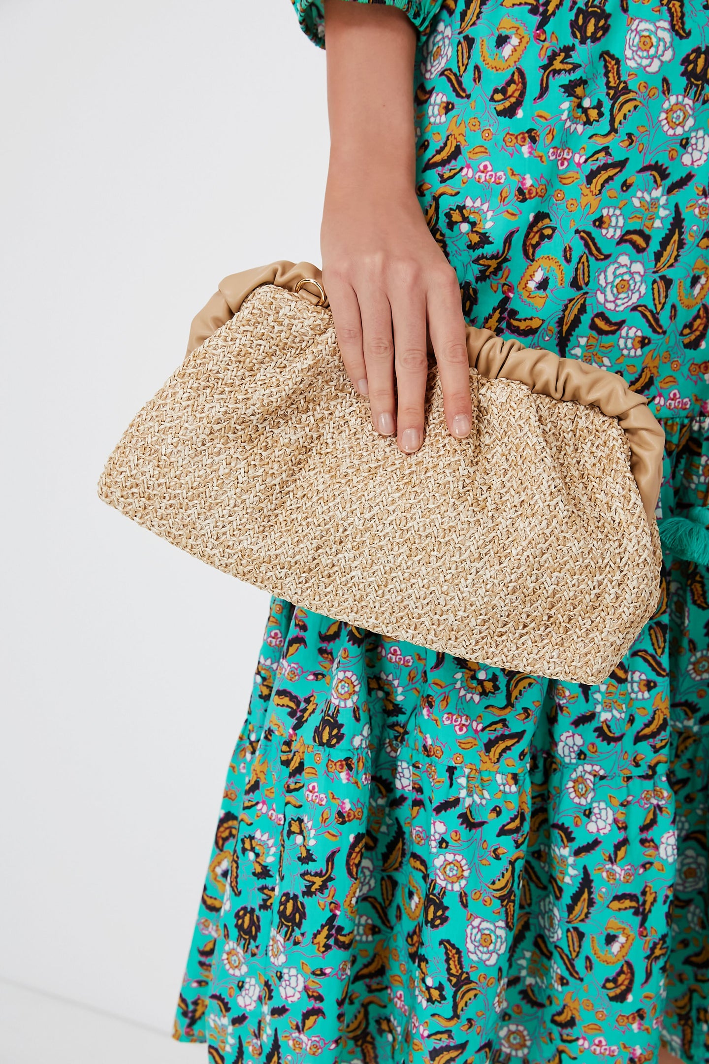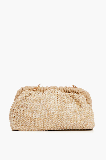 Meet Delvina, your new best friend for a night out! This beautiful clutch is made with all-over natural straw, giving it a fun and festive vibe. The leather trim adds a touch of luxury, while the fabric lining and inside pockets keep your essentials safe and sound. Plus, the detachable gold chain strap means you can carry it as a clutch or wear it as a crossbody bag. No matter how you carry it or where you go, you'll be sure to receive lots of compliments!