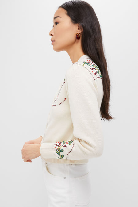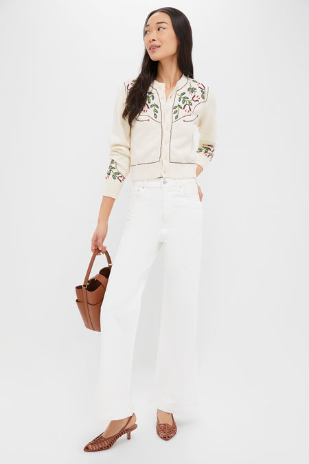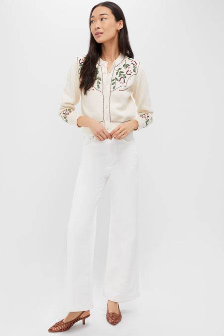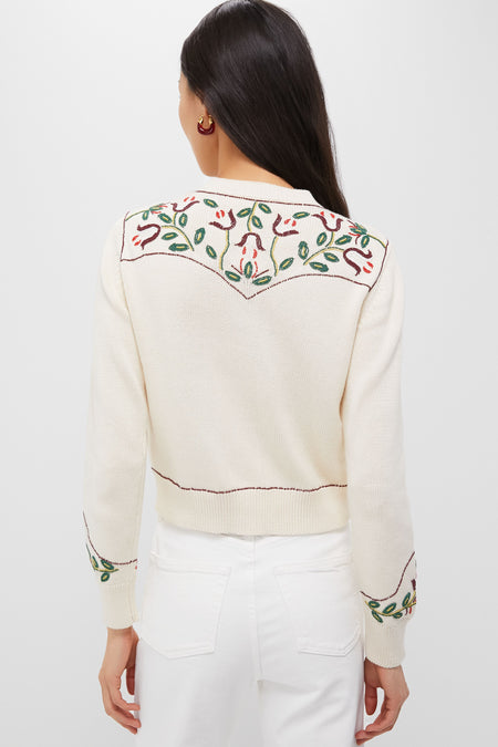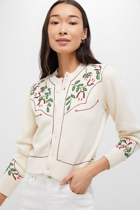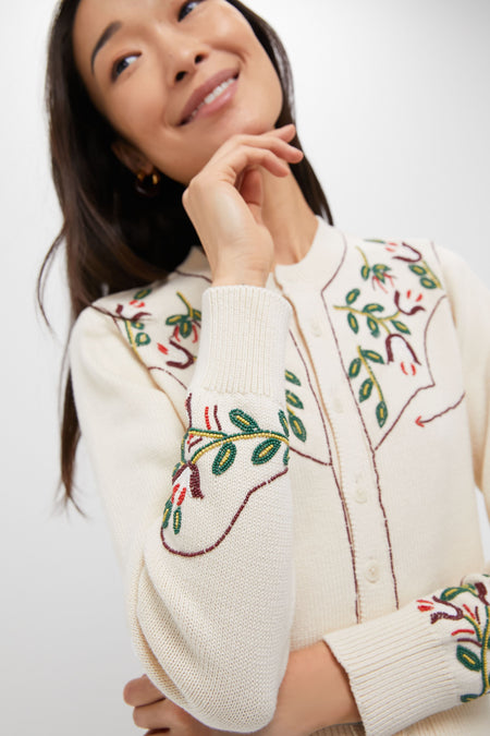 This chic style is adorned with hand-embroidered beading that creates a western floral yoke and sleeve cuff. The cardigan has a slightly shrunken fit with a crew neckline, a cropped length, tapered sleeves, and corozo buttons down the front placket for a classic, vintage look. Pair with denim skirts or pants and boots for an elevated cowgirl look!