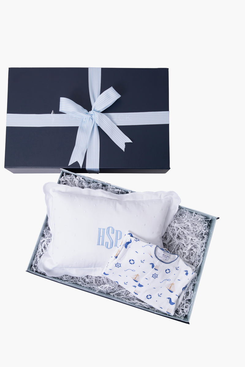 Tuckernuck Tots is your one-stop-shop for all baby and toddler gifts. The Nautical Night Time Gift Bundle features pajamas and a monogramed pillow. This is the perfect gift for a mother-to-be!