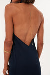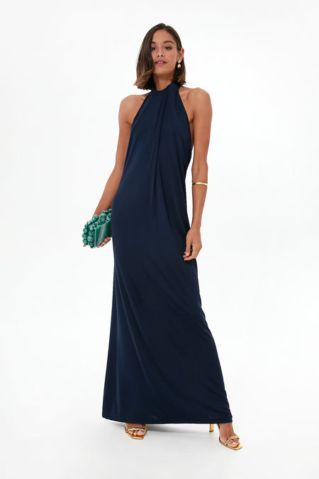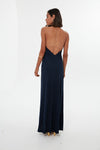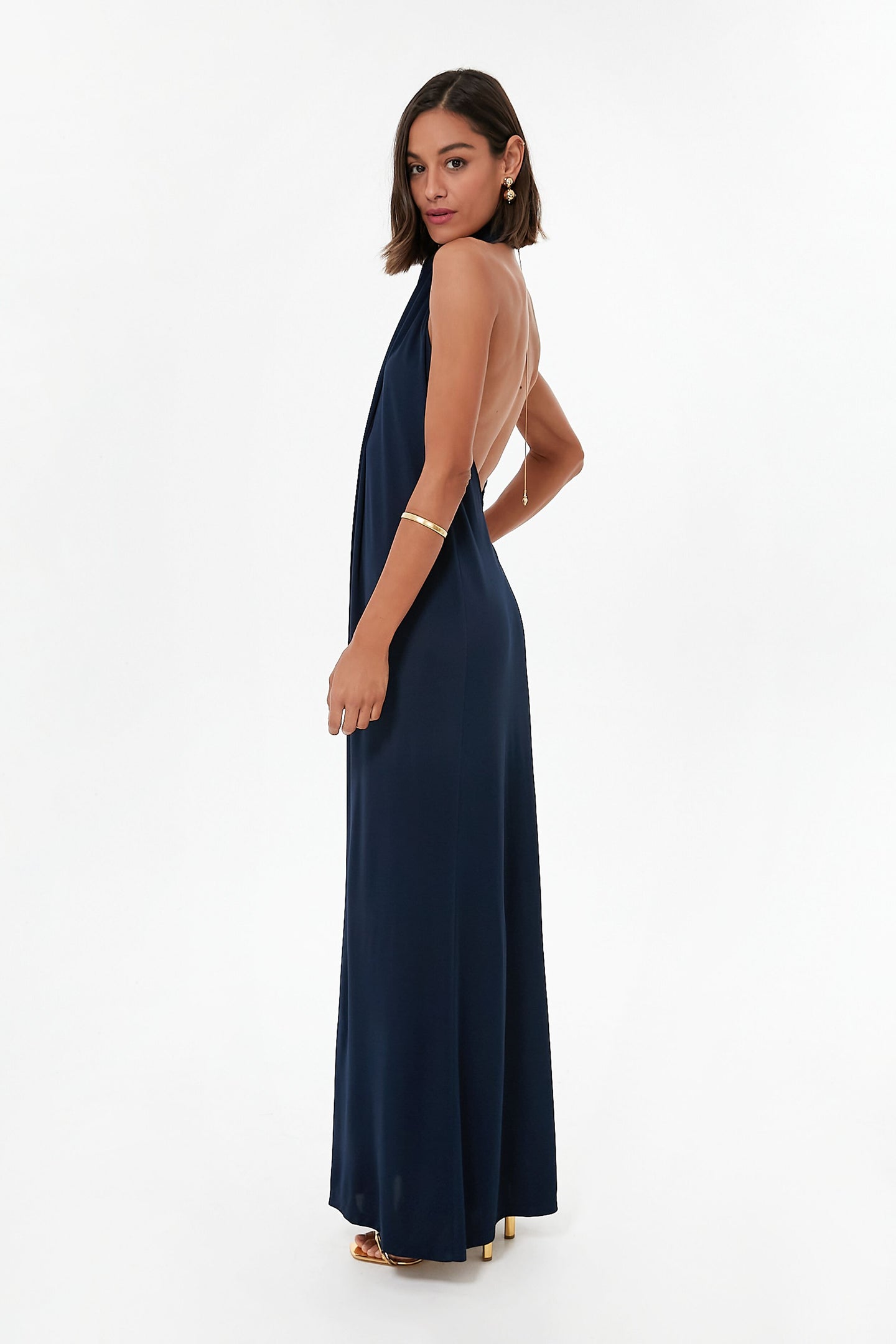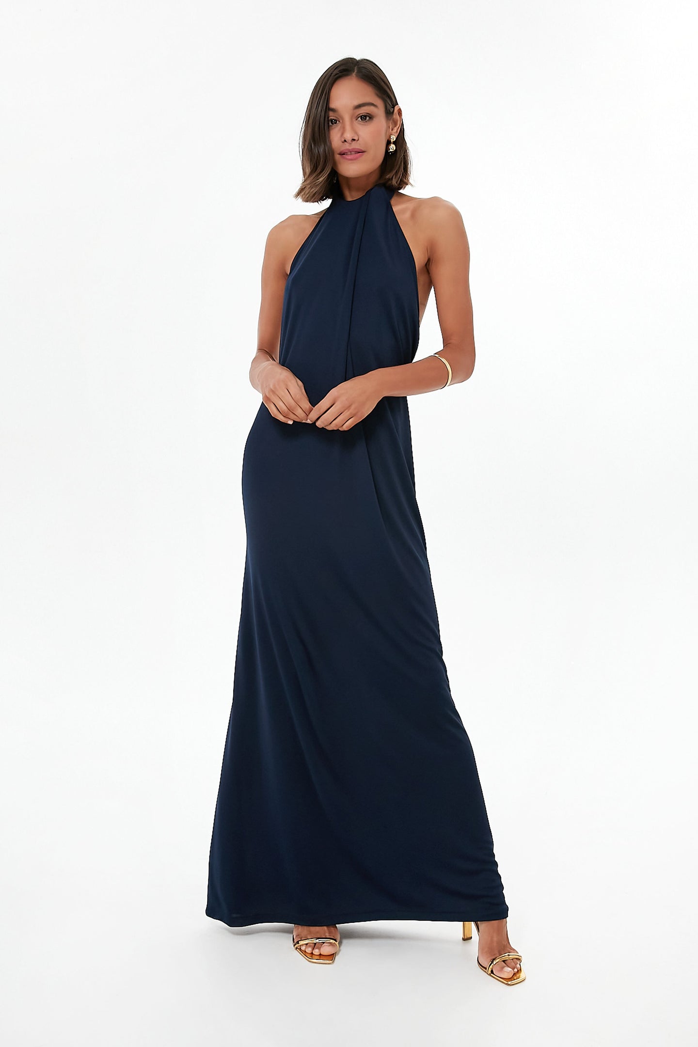 A dramatic choice, the Navy Blue Crocus Dress is cut from a luxe, soft jersey material that drapes beautifully to create a sultry and sassy silhouette. Designed with a halter neckline and a daring low back, this maxi is an elegant option for a stand-out look. Complement the floor-sweeping hem with gold heels and a statement clutch to finish your magnificent ensemble.