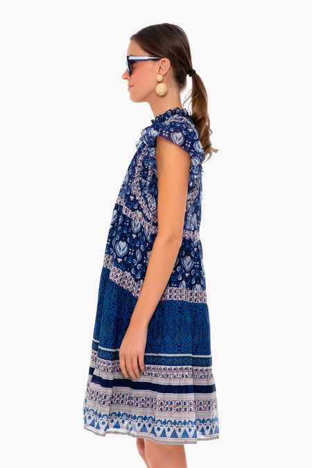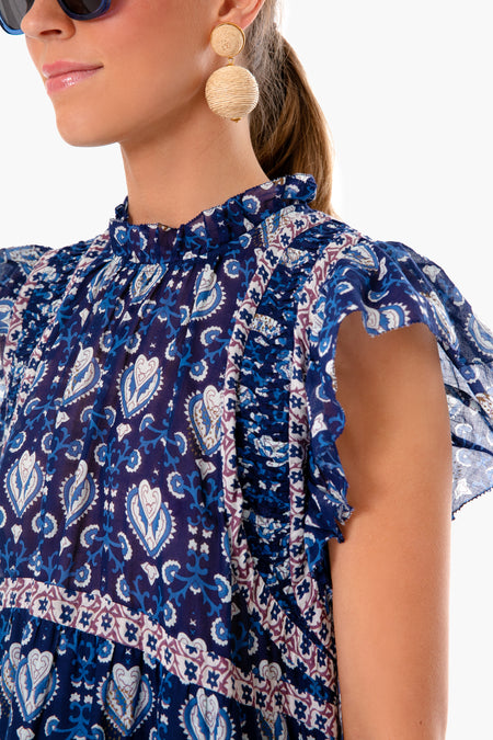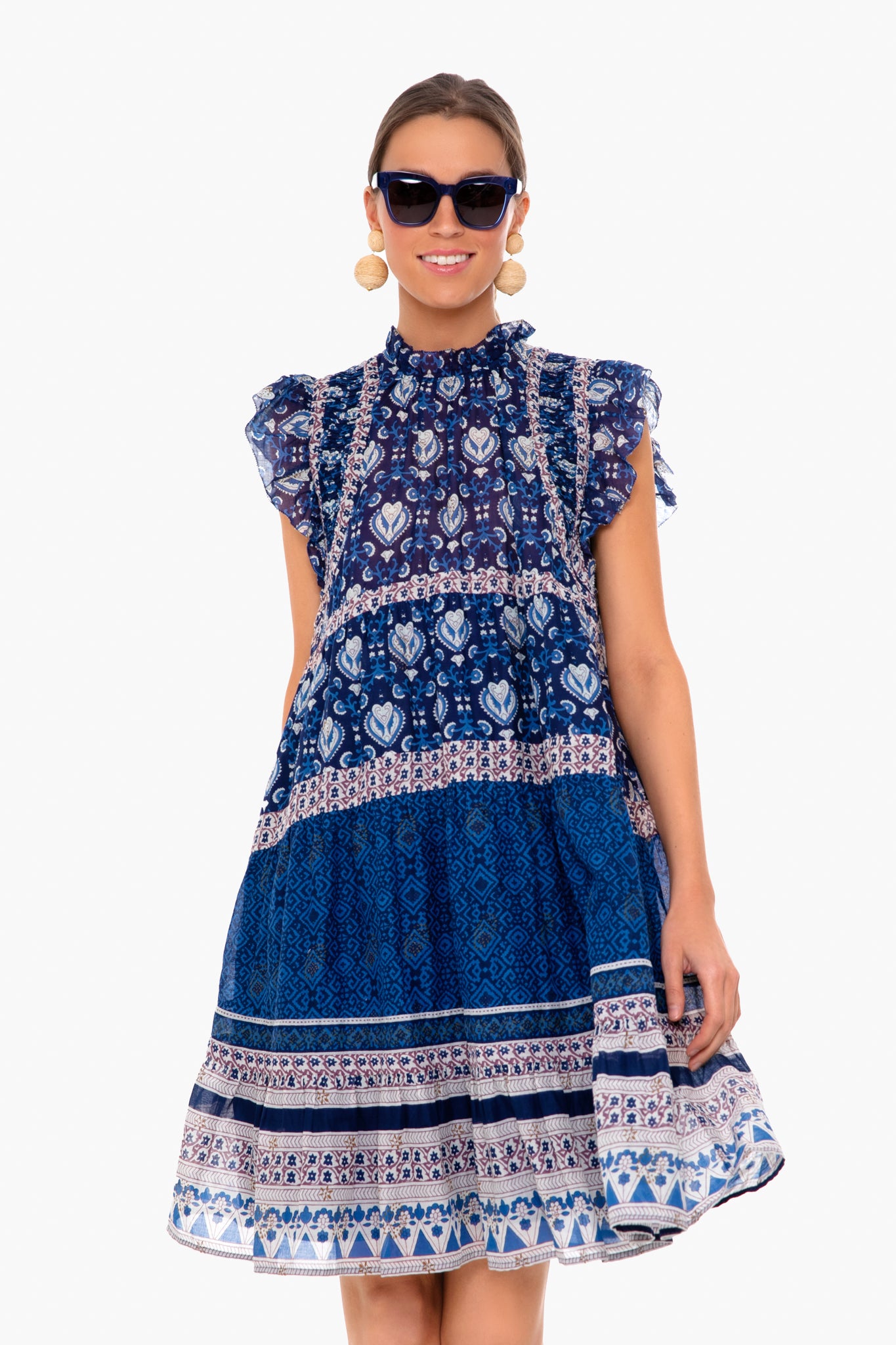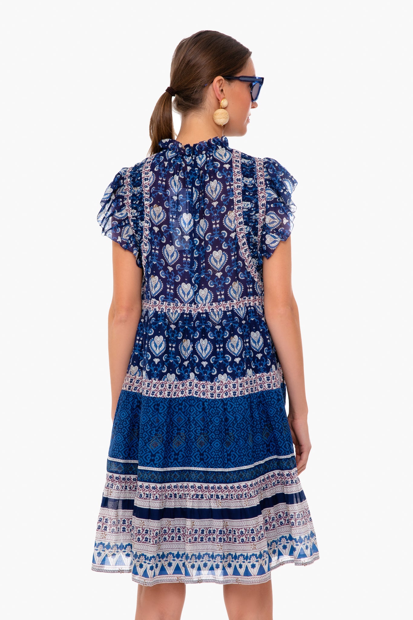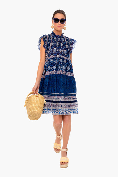 The Navy Brigitte Border Mini Dress is unique and bold, making it a must-have. Ruffle details, a smocked bodice, and a vibrant hue add a feminine and flattering touch to this boho print. Pair with sunglasses and raffia accessories for a look that is vacation-ready.