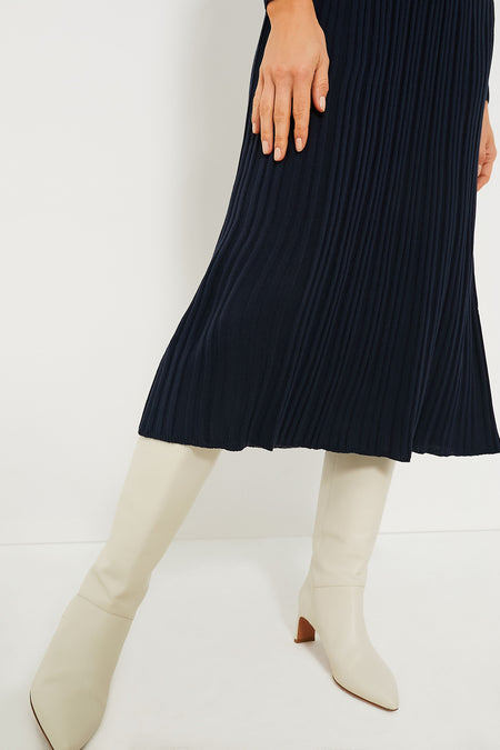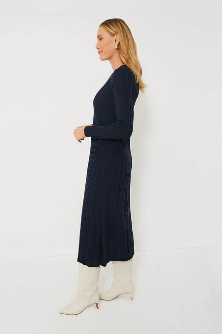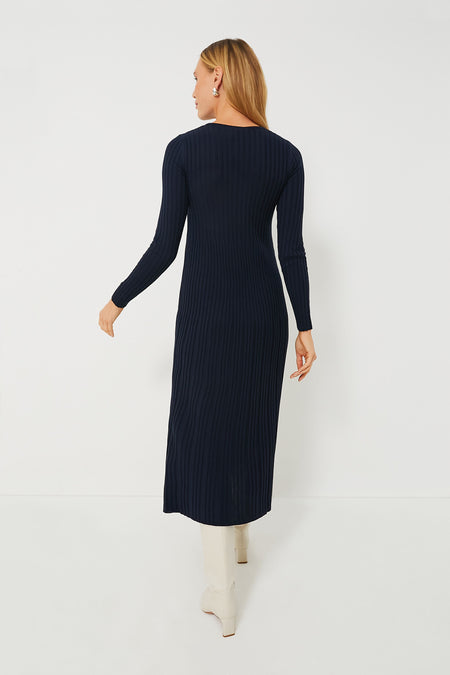 A true wardrobe essential, we love the Navy Eletta Dress for its flattering slim fit and classic colorway. Perfect for wearing to brunch with your girlfriends, functions at the kids' school, or for dinner and a show, this style staple looks great with boots, heel, and more. Complete with a ribbed knit texture, this is the kind of silhouette you will definitely want to keep around!