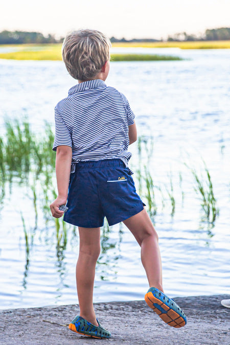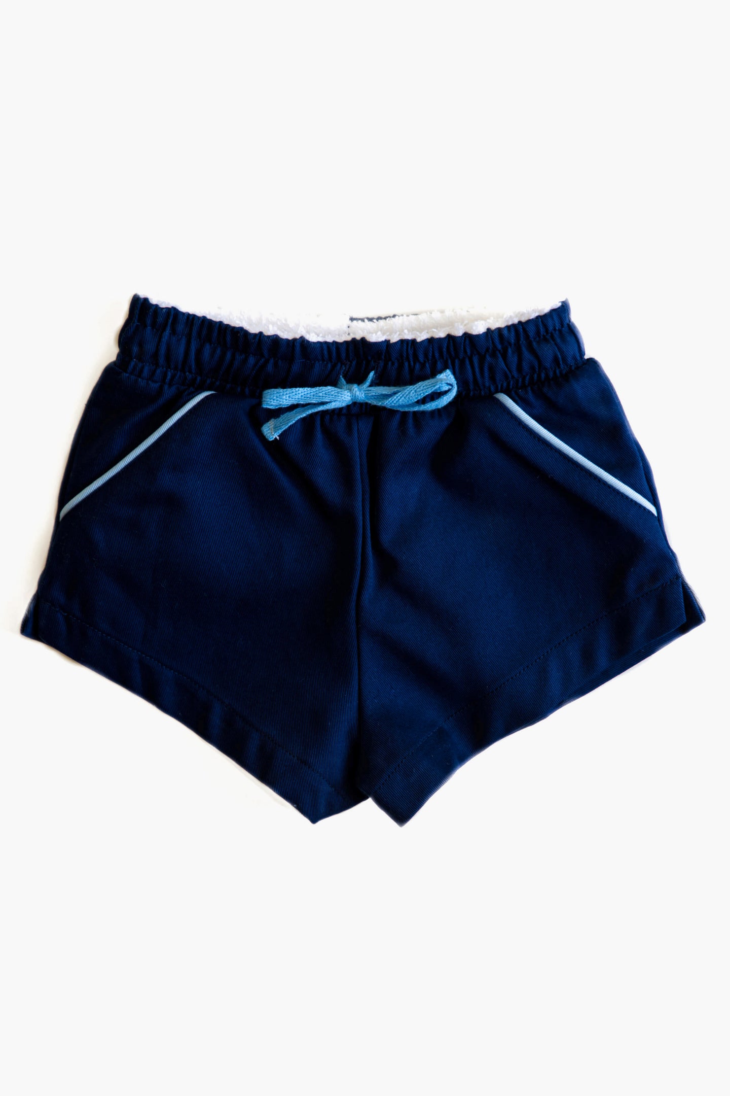 The Navy Grayson Shorts are a classic style with a stitched drawstring and terry-lined waistband for comfort. Featuring faux front pockets with contrast piping and a functional back pocket, these cotton shorts are soft, durable, and machine washable!