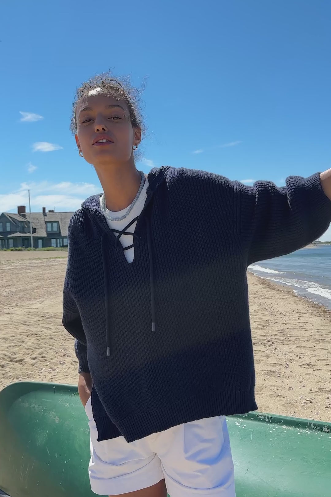 An ideal style for running errands, grabbing lunch with friends, or shopping around town, the Navy Knit Declan Pullover is effortless and oh-so-classic. This slightly boxy top boasts quarter-length sleeves, a front lace-up tie closure, and a curved hem, this stunner checks all the boxes. Pair with denim shorts and sneakers or layer it over a striped-tee and your favorite tee for a playful yet chic everyday look.