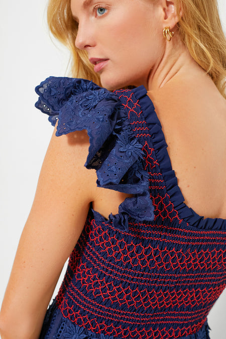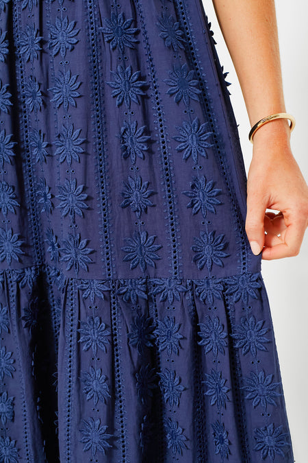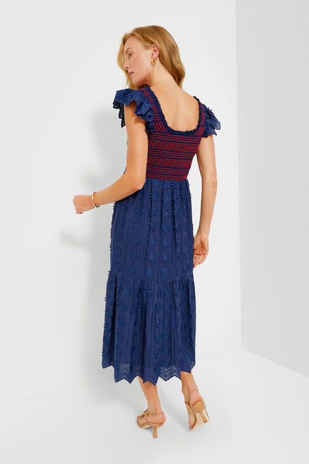 The style staple Mallie Dress is back in a beautiful navy lace fabric that is sure to bring a subtle feminine number to your closet. The perfect flirty frock for all your warm weather events, this maxi features a stretch smocked bodice, ruffle details along the seams and sleeves, and a chic square neckline. Pair with raffia accessories and sandals for a casual daytime look and switch to heels and statement jewelry for date night out.