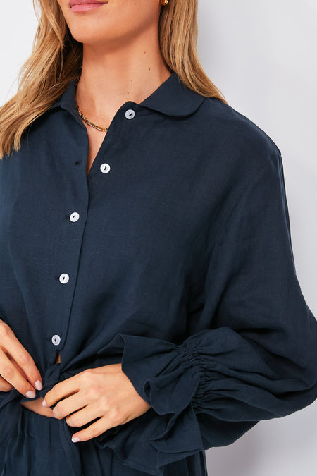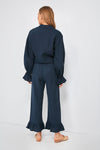 The most playful set we ever did see, the Navy Rumba Lounge Suit is cut from airy and breathable linen that is soft to the touch and oh-so-luxe. A classic navy hue is complemented by fresh details like a rounded collar, ruffle cuffs, and a tie-front detail. Relax in this while curled up reading a good book or sipping your morning latte to start your day off right!