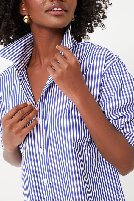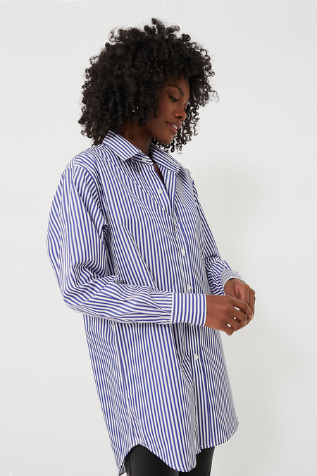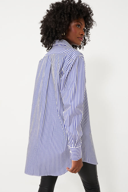 The Navy Stripe Oversized Shirt is a closet staple promising comfort without compromising on style. Crafted from ultra-breathable Egyptian cotton, this oversized style offers a crisp and classic silhouette with front buttons that will take you from desk to drinks with ease. Pair with boots and jeans for casual Fridays at the office, or wear with heels and gold jewelry for a nights out. Either way, this versatile piece is a must-have for any wardrobe.