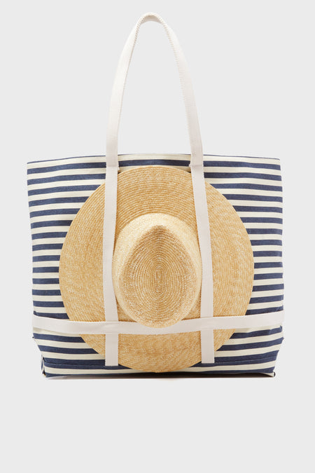 The Navy Striped Sunhat Size Traveler Tote is sure to brighten up your vacation and beach days with a special built in spot for you favorite sunhat. Packable for easy travel and room for all of the beach necessities like sunscreen, a bathing suit, sunglasses, and a good read. We are loving this practical and on-trend tote for never ending room ensuring the best relaxation day.