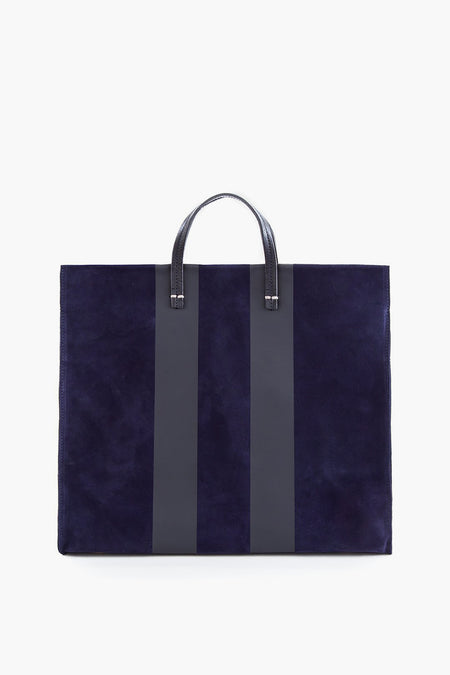 Clare V. is known for unique twists on classic shapes with modern details and Parisian charm. The Navy Suede Simple Tote is made from heavy-weight, luxurious Italian cowhide. Featuring heat pressed matte black stripes and a removable black leather strap, this bag is perfect for the girl-on-the-go who never sacrifices style.