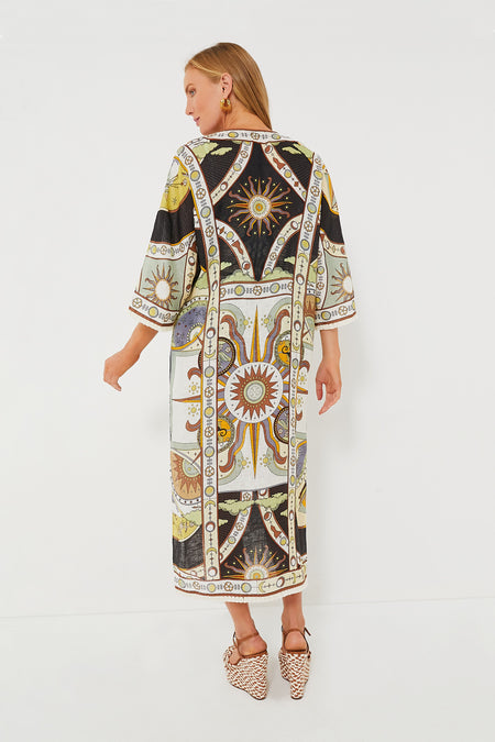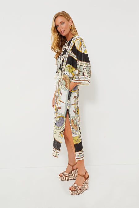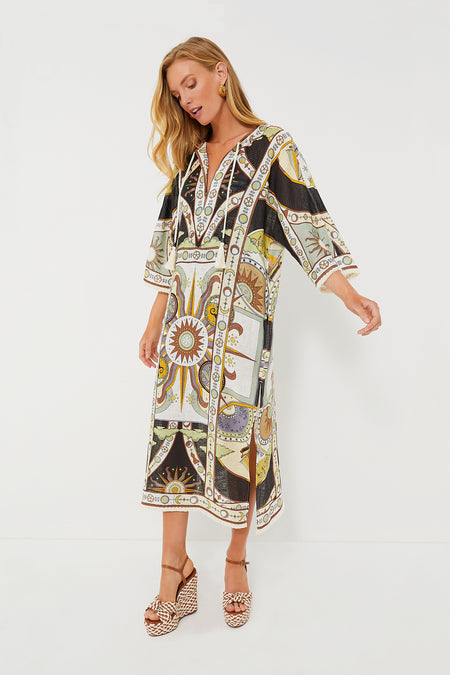 We are loving the ethereal Navy Sundial Printed Linen Caftan by Tory Burch. The lightweight fabric and ankle length makes this a perfect transition piece from lounging by the pool to a beach-side dinner. This look is complete with a V-neckline, side slits, and three-quarter sleeves. Pair with sandals and a sun hat for daytime and put on some wedges and gold jewelry for the night!