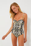 There's no silhouette quite as beach ready as the Navy Sundial Printed Underwire One Piece! With romantic details such as a sweetheart neckline and thin shoulder straps, as well as functional aspects like supportive built-in underwire and SPF 50 protection to keep you covered, this is sure to become your go-to swimsuit. Pair it with a sunhat for days spent lounging poolside, and throw a caftan on top for an easy, breezy look perfect for walking on the beach.