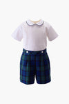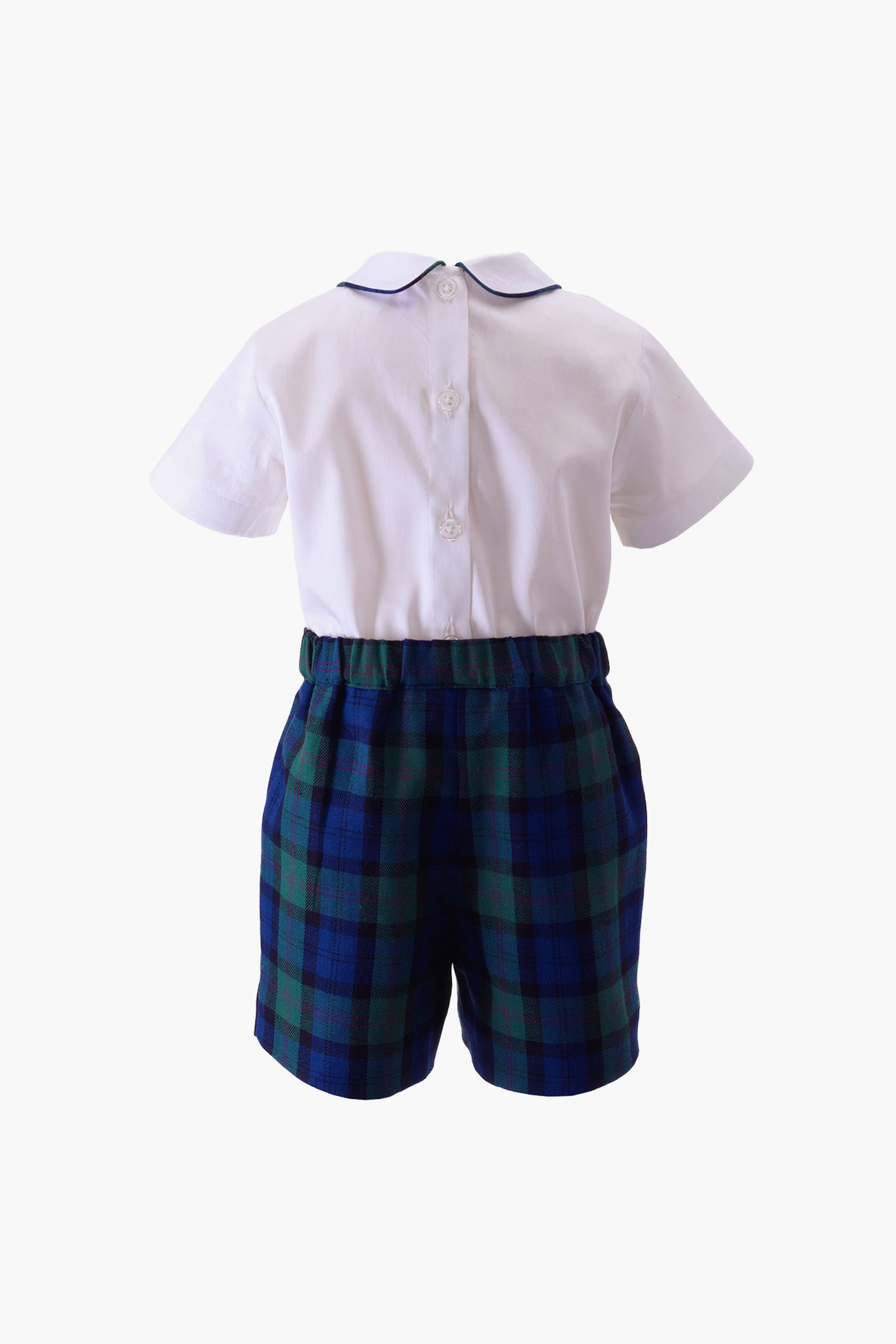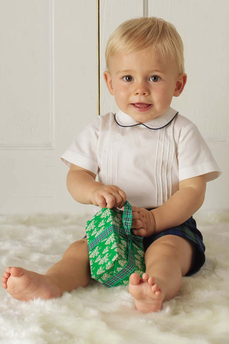 The Navy Tartan Shirt and Shorts Set is a classic formal outfit for your young gentleman’s holiday wardrobe. Crafted from organic cotton, it features an ivory peter pan collar top with coordinating trim and flannel shorts with an elasticated back for comfort fit and a flat front. Perfect for special occasions, family photos or a holiday celebration, your little one is sure to look spiffy and polished.