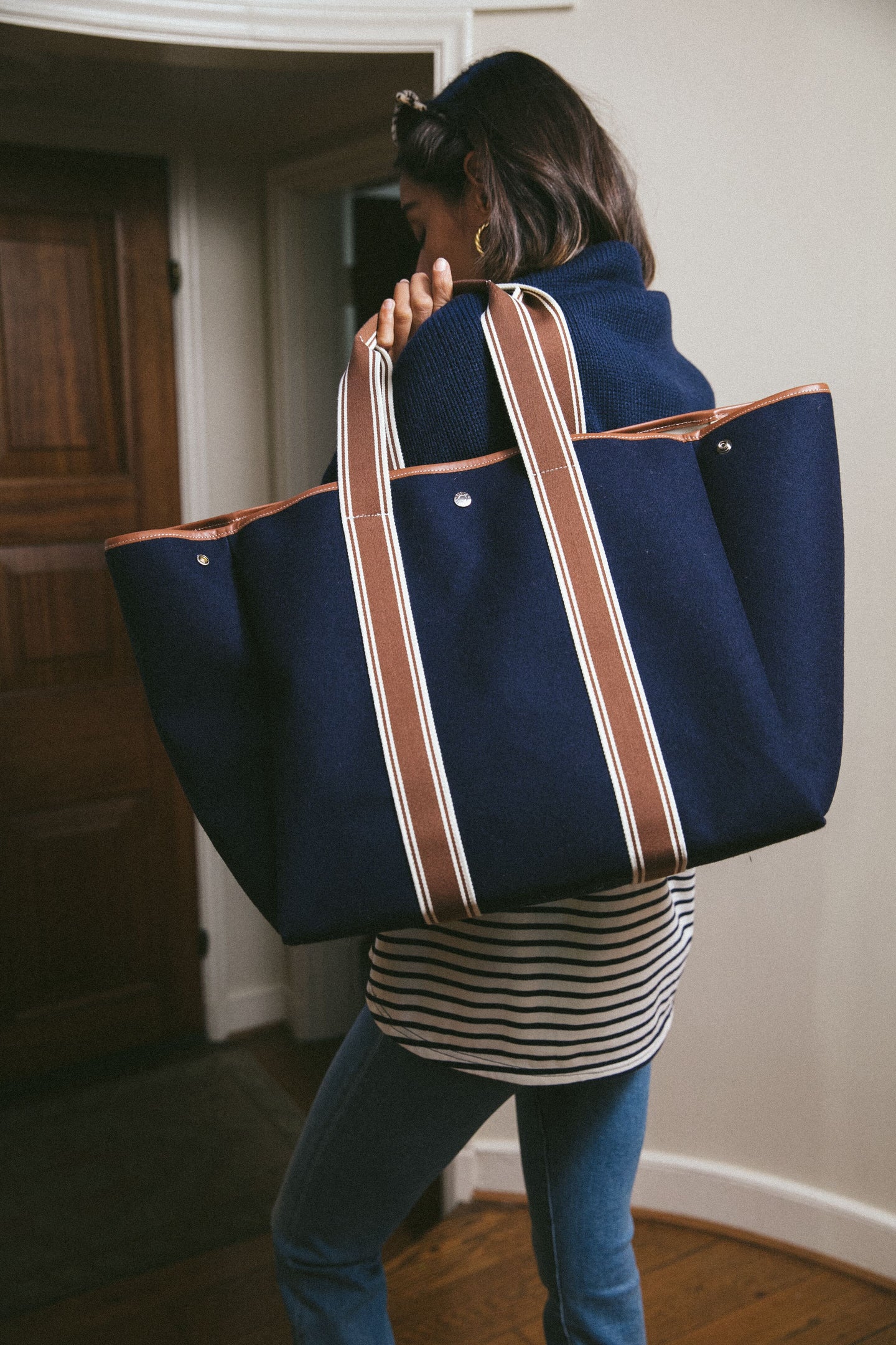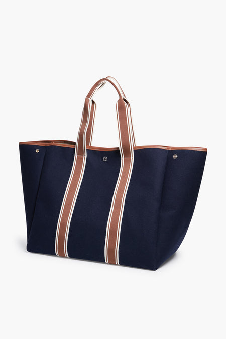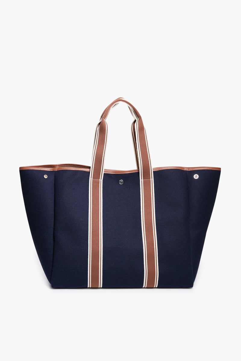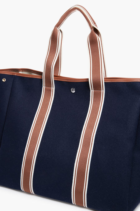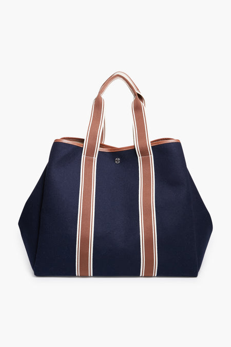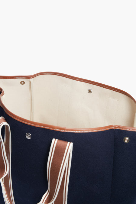 The Navy Traversee L Flannel Cruise Tote provides all of the space and style you need for an everyday work bag or for an upcoming weekend trip. Crafted from a luxe wool flannel with sturdy yet chic contrast top handles, this bag will stick with you for years to come. With silver hardware and a detachable strap, you can wear this versatile style on your shoulder or carry it by hand. Perfect for a quick getaway or a busy day running errands, this tote will make bustling around just that much easier.