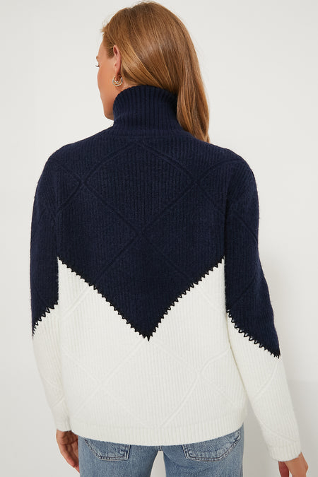 The Navy & White Diamond Demi Turtleneck is the best way to celebrate sweater weather! Ultra-soft and stretchy midweight knit, with a color block pattern, shapes this cold-weather essential that has a turtleneck, long sleeves, and a relaxed bodice. The delightful whipstitching detail makes this pull-over unique and we love styling it with white denim and sandals for an effortless and breezy daytime look that'll take you from errands to lunch with ease.