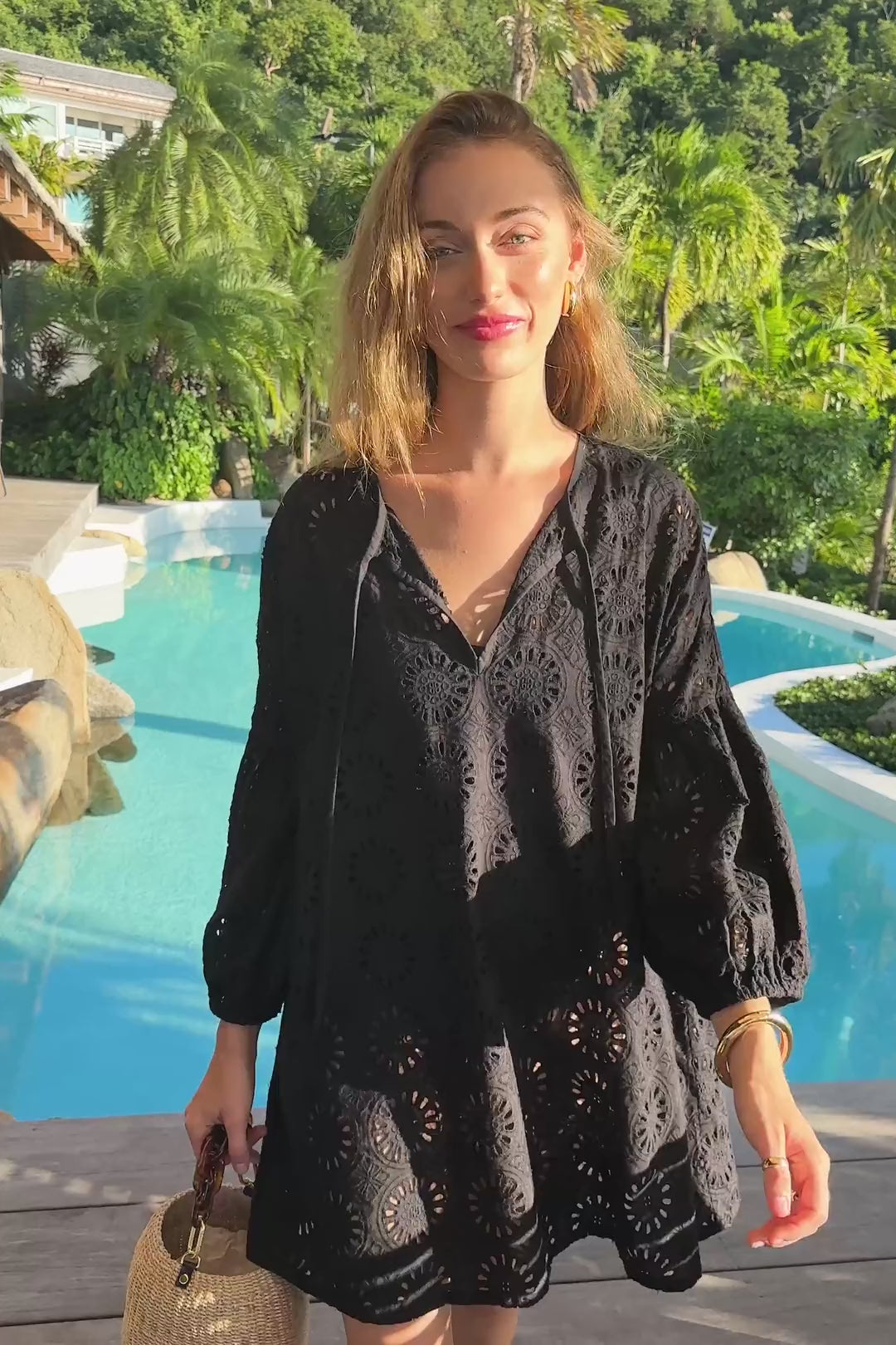 A classy style that can seamlessly take you from the beach to the bar, the Noir Eyelet Cleo Mini Coverup is an A-line silhouette that has long puff sleeves, a front tie closure, and a V-neckline. Unlined so you can let your bathing suit shine through, this is ideal for throwing on before a day of fun in the sun!