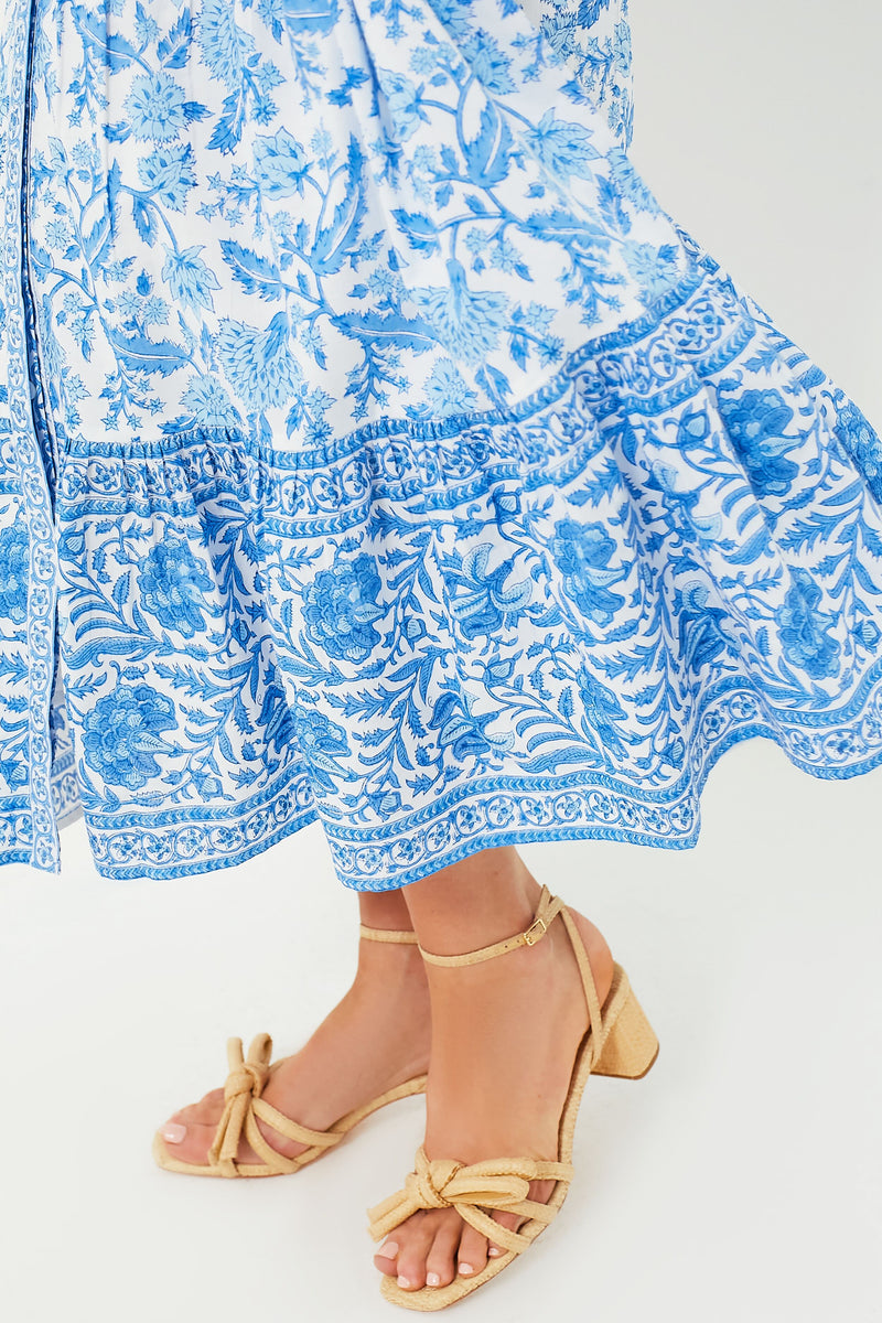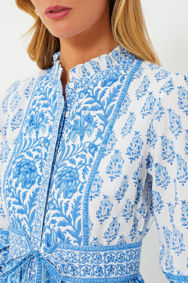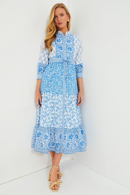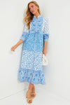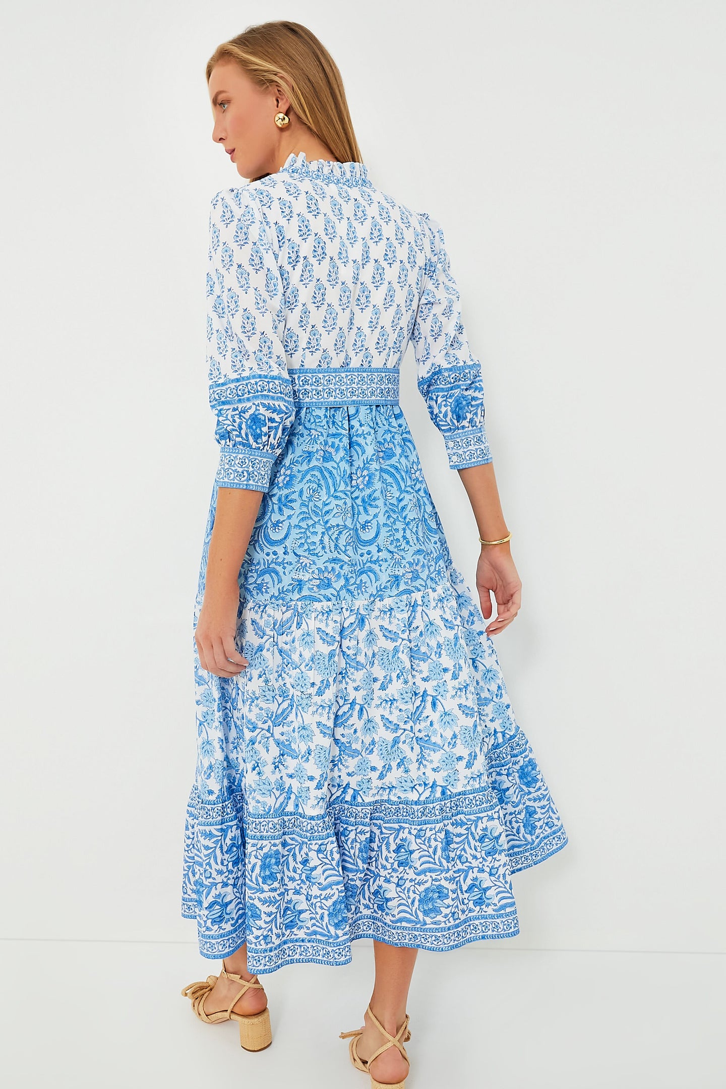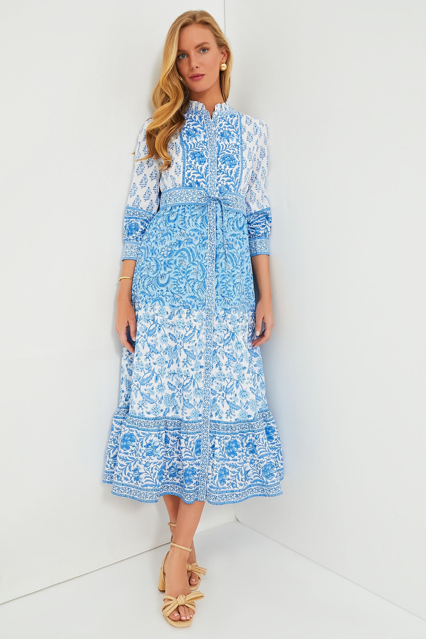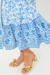 The Ocean Mix Gemma dress is a real show-stopper. Crafted from a mix of graceful block-prints in rich, blue hues, this dress features a statement border placket, ruffled collar, and print-mix tiered skirt. Cinch in your waist with the matching feature belt, or wear open and relaxed for easy days at home. This is a statement piece you’ll treasure for life- just add heels or sandals depending on the occasion!