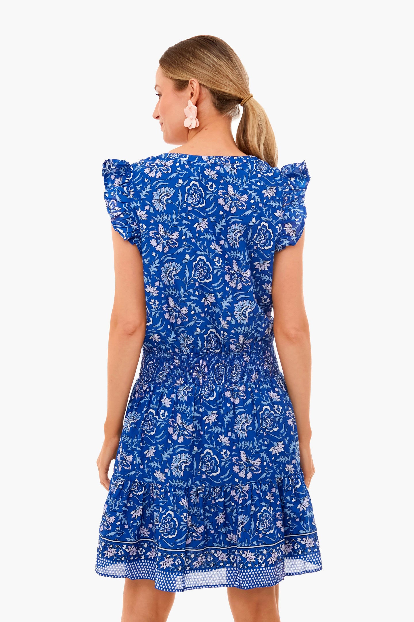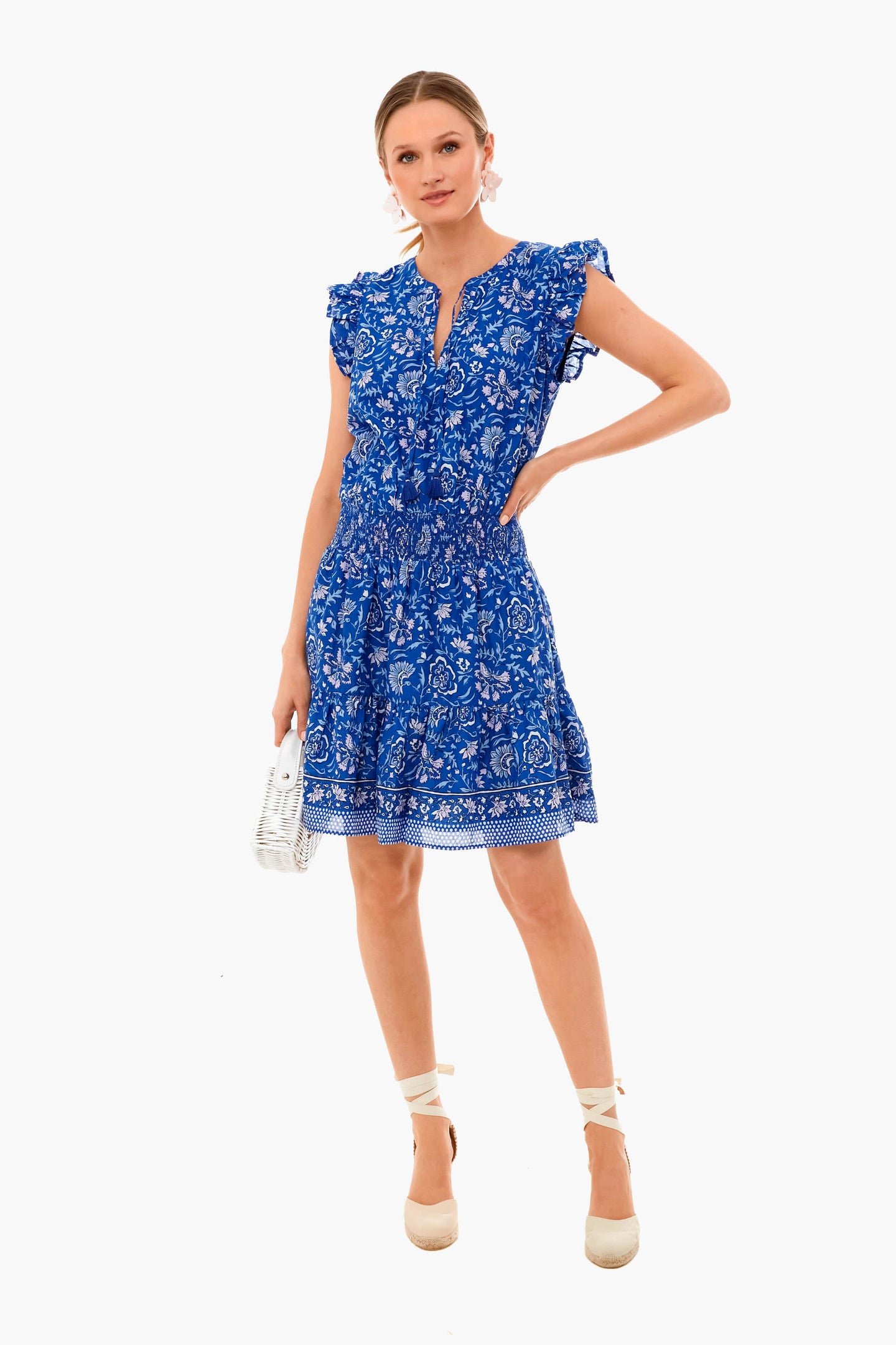 This beautiful dress features a flattering smocked waistband and breezy silhouette. With delicate ruffle details throughout, a split neckline, and shirring in the skirt for extra flounce, this style is whimsical and twirl-worthy. Pair it with statement earrings and wedges for baby showers or brunch!
