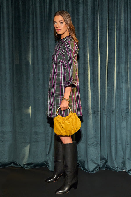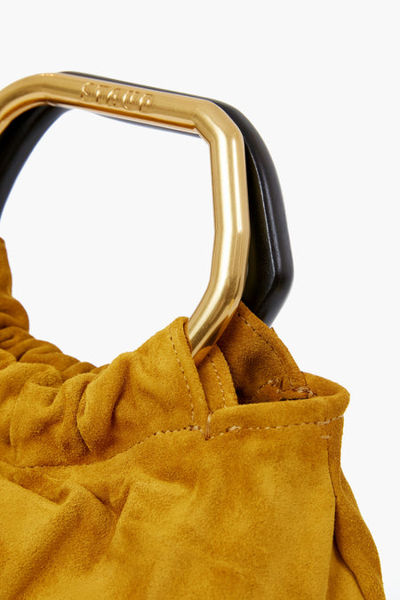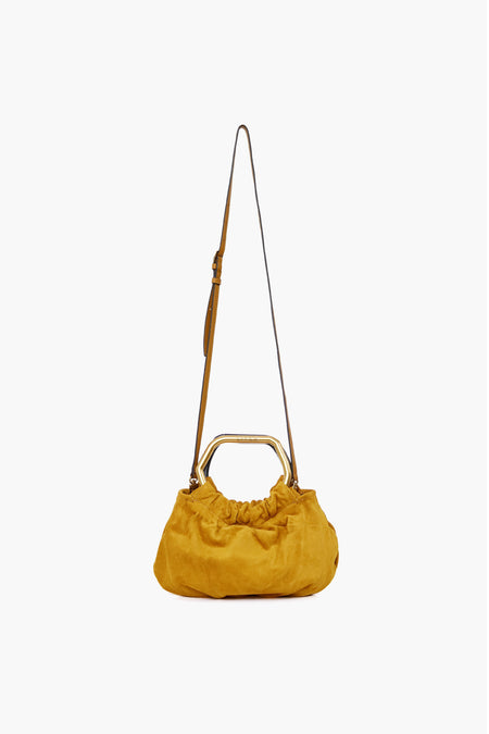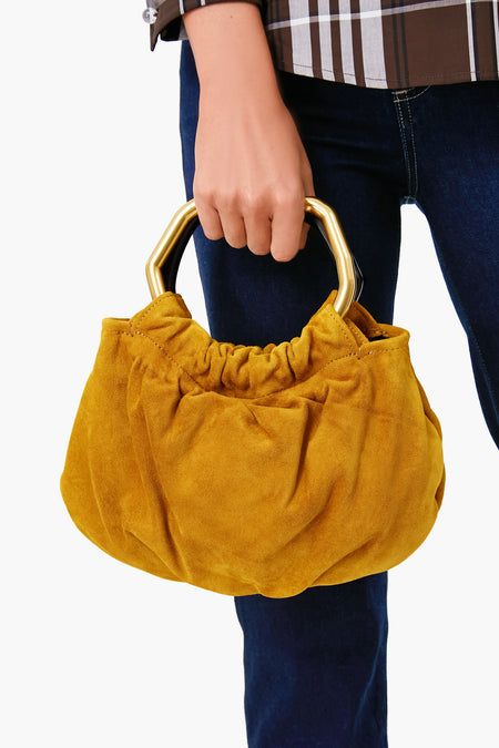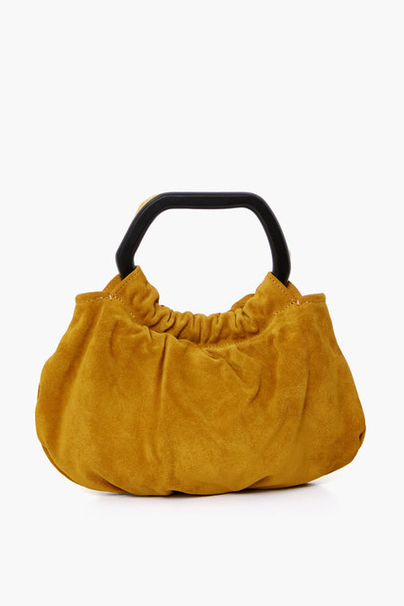 The Ocher Camille Bag is a soft-to-the-touch handheld purse with a removable crossbody strap. This style features one wooden handle and one gold handle in unique amorphous shapes to create intrigue and make this silhouette stand out from the rest. With a luxe suede finish in a caramel-tinted hue, this is THE bag for fall. Pair it with a chic coat or a blazer for a modern and cool look.