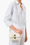 The Off White Smooth Mini Alexandria is made from soft, padded leather. A sense of symmetry is emphasized by the large, quilted panels and a metal lock that securely closes the top flap. Featuring internal slip pockets to organize your essentials and an adjustable crossbody strap, this tote is effortless and chic!