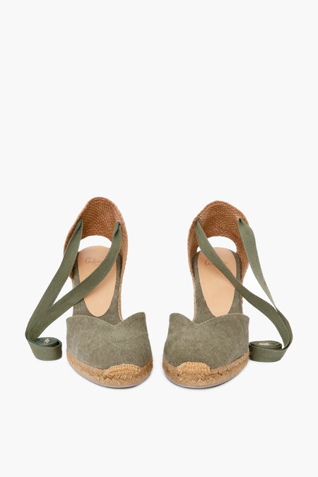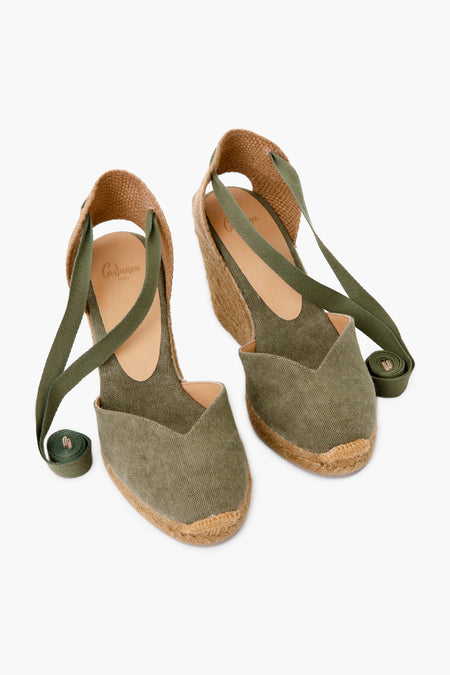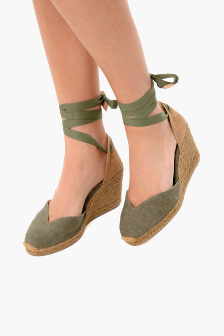 Made in a neutral olive hue, the Chiara Espadrille features a thin wrap-around strap that adds a delicate twist. From date night to dinner al fresco, you will keep reaching for these comfy heels.