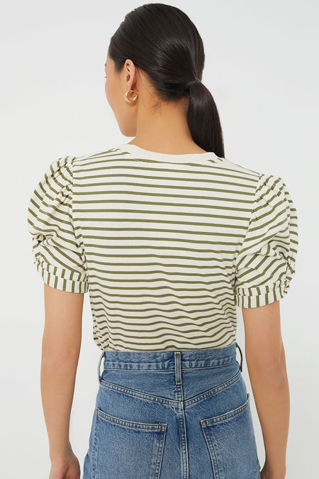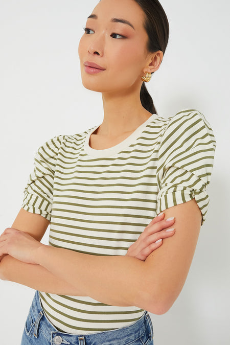 Basic yet fun, the Olive Striped Vesty Puff Short Sleeve Crewneck is the casual cool number you need to update your wardrobe. Featuring slightly puffed sleeves with a knot tie detail and a loose fit, you'll constantly reach for this piece time and time again. From errands to lunch, we are pairing this with your go-to denim and tote.
