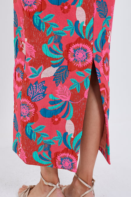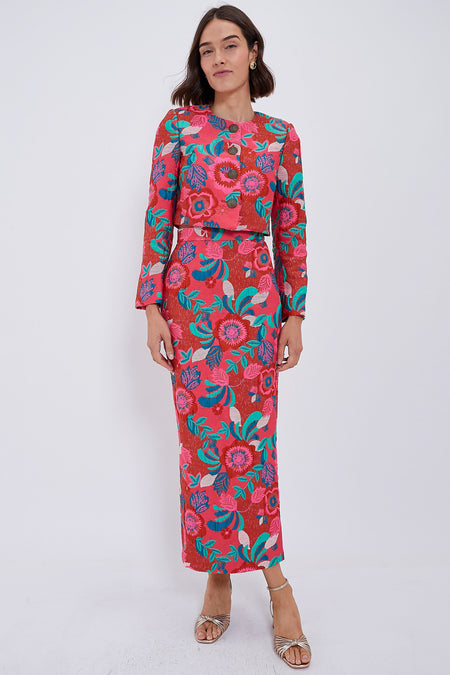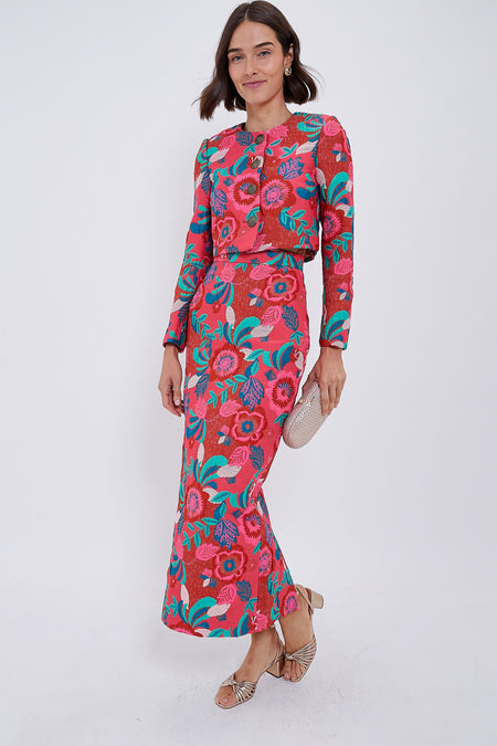 This show-stopping skirt features a colorful design on a structured, luxe fabric. Tailored with a classic pencil shape, it includes a back slit for ease of movement. Pair with a neutral tank or with the matching Orchard Blooms Vika Jacket for the full set!