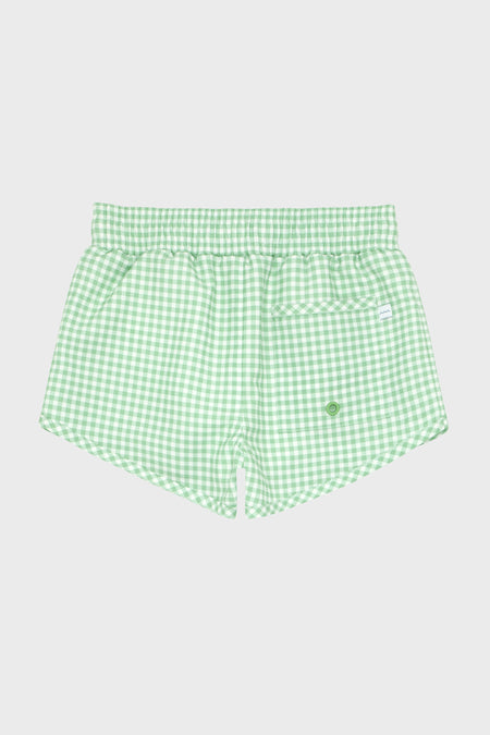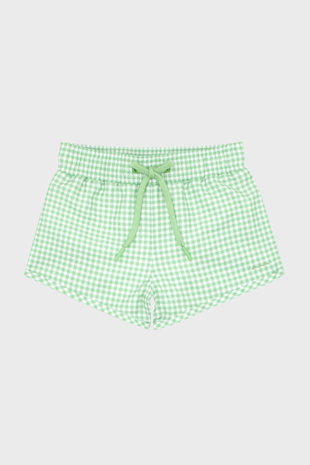 Get ready for summer fun with the Palm Gingham Boardie. These stylish shorts hits at the perfect length for style and function, with a drawstring cord and elastic waistband. The inside stretch liner adds to the comfort and mobility — perfect for beach days or pool adventures. Pair it with the Crane White Rashguard for all-day fun in the sun.