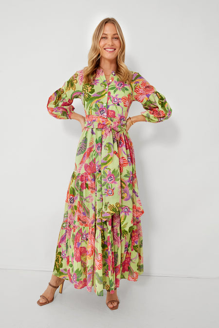 Breathtakingly beautiful with an ultra-bold print, the Paradise Lilith Dress fresh, fun, and funky with its multicolor florals and parrot motifs atop airy cotton voile. The ultimate silhouette for comfortable yet chic dressing this season, we love this maxi's bracelet length blouson sleeves, optional self-tie belt to cinch the waist, and superbly swishy tiered skirt. Style with heels and a clutch for sunny celebrations this season, or take it in a more casual direction with sandals and gold hoops.