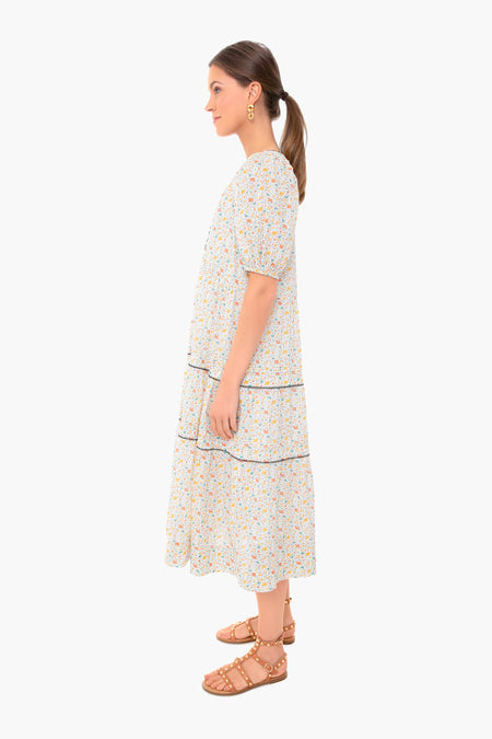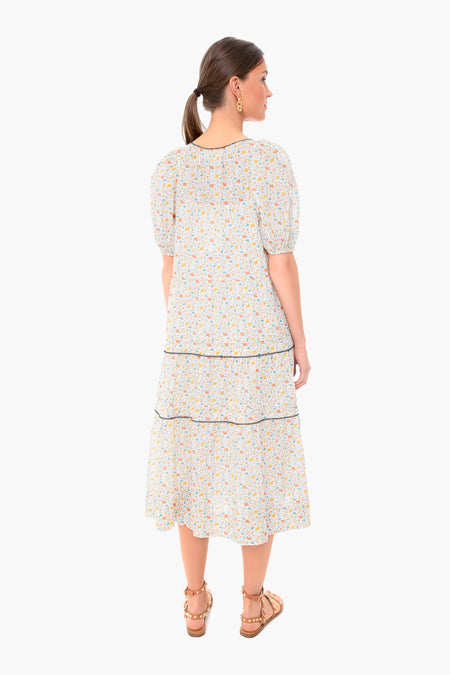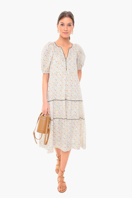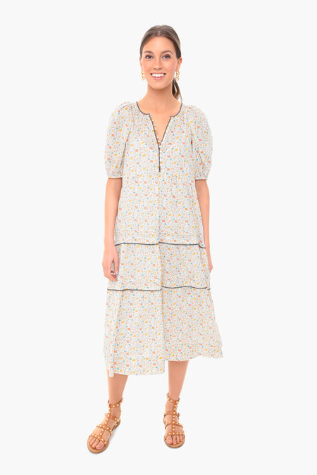 The Pastel Floral Ravine Dress is made from a colorful ditsy print with puff sleeves and a covered button placket. Featuring black whipstitch details, this midi is effortless and airy- perfect for spring adventures. We are wearing it with sandals and gold jewelry for a light and feminine look.