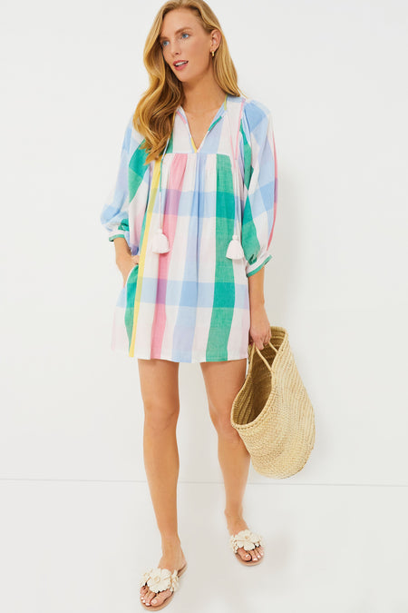 The perfect mini for dressing up or down, the Pastel Plaid Daisy Dress features billowy sleeves, a breezy fit, and tassel self-ties at the neck. This dress is a chameleon- perfect for vacation, a casual workday, lunch with friends, a bridal shower, or just because! Pair with espadrilles or platform sandals for a more elevated look, or with simple sneakers or flats- you really can't go wrong!