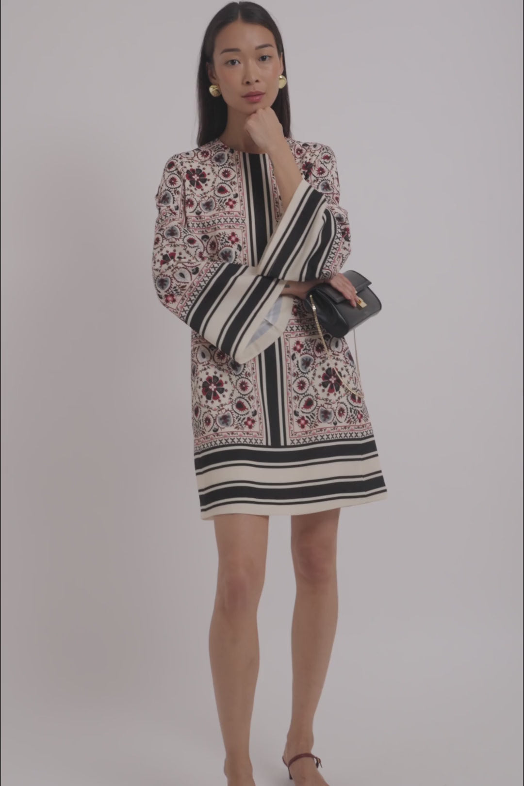 Dance the night away in the Patchwork Floral Mini Jamie Dress. This A-line mini blends classic elegance with cool modernity by juxtaposing florals and stripes for an eye-catching design. The long bell sleeves and sleek silhouette lay the foundation for endless styling! Pair with high boots and a shoulder bag for a groovy look, or with pumps and a clutch for cocktail parties.