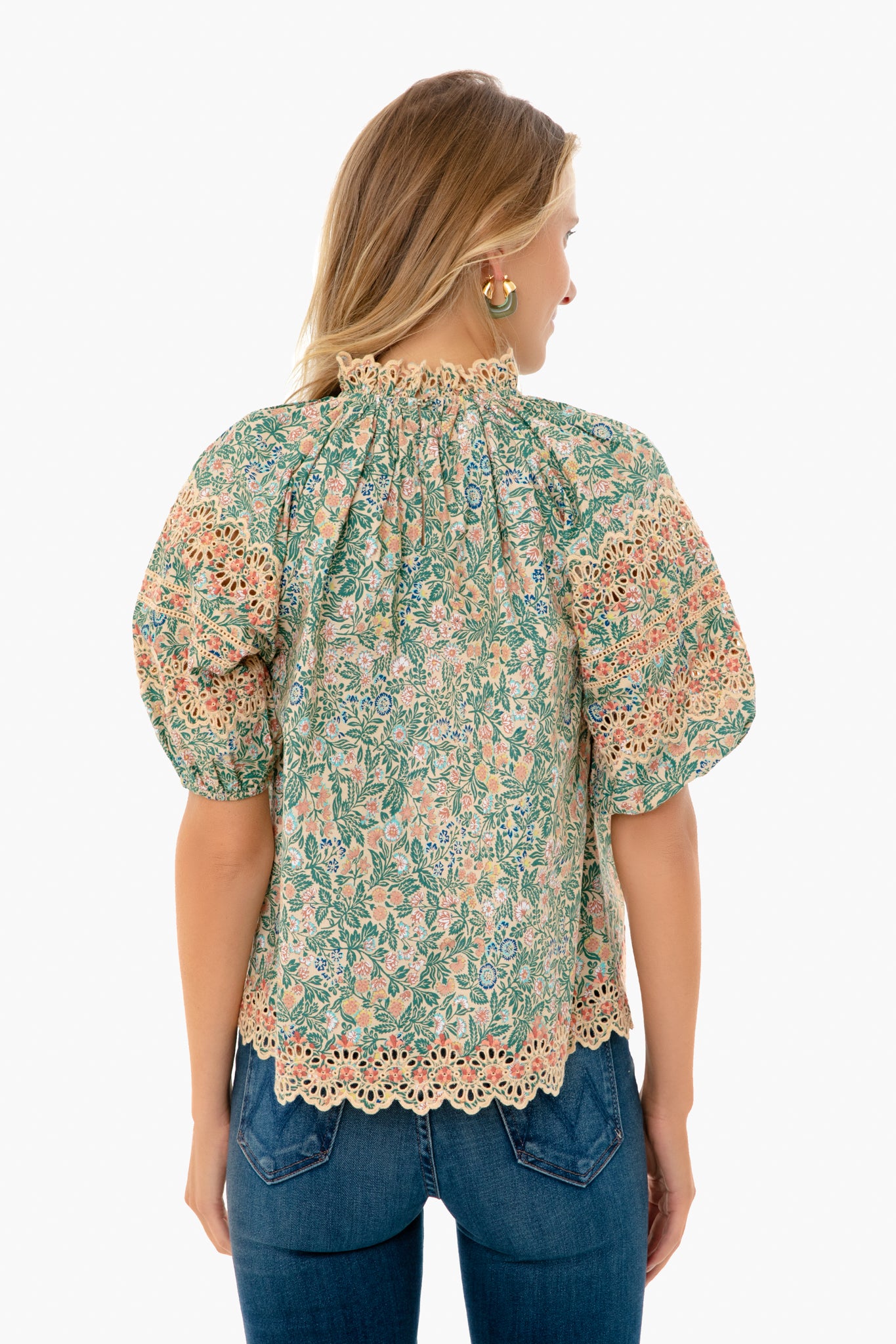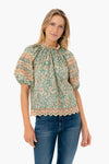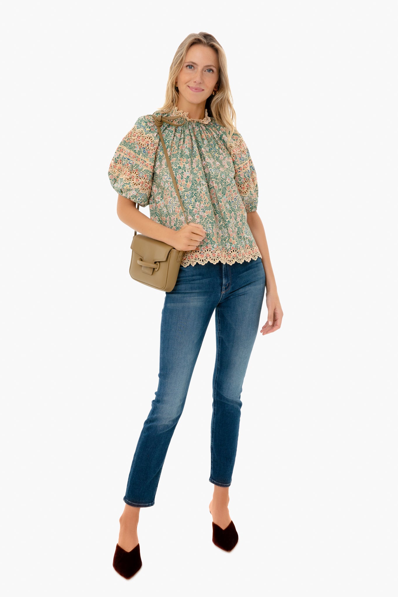 The Lorna Blouse is crafted from a beautiful and intricate French Calico Floral printed cotton poplin in soft shades of peach and sage. It features a short sleeve silhouette, high scalloped neckline, voluminous balloon sleeves, and button closure. We are pairing this top with denim and layered gold jewelry for a chic look this season.
