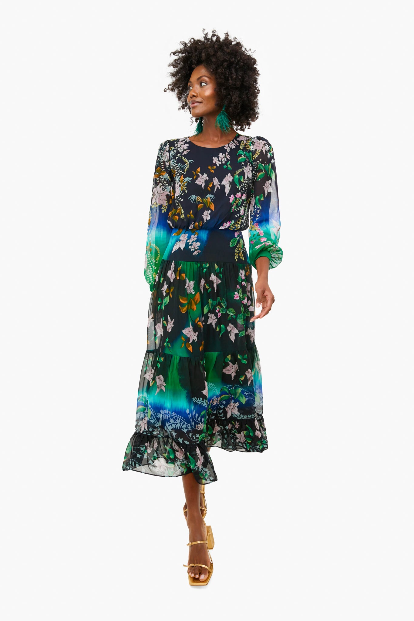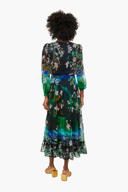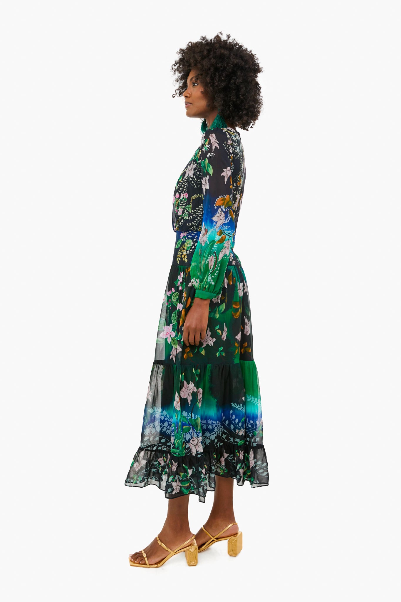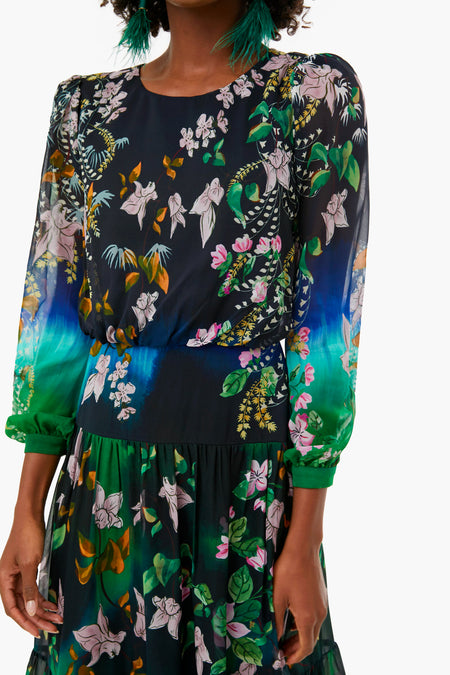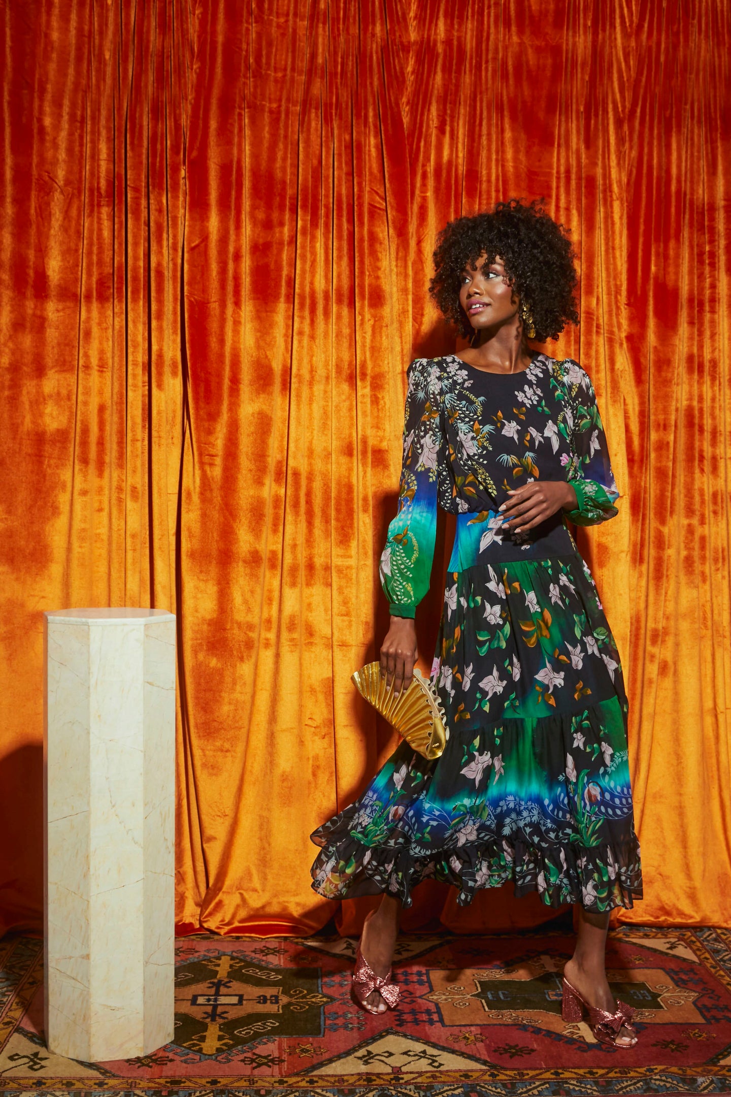 Feminine and flirty, the Isabel Dress is refreshed in a peacock orchid print. It is the perfect choice for formal weddings, dinners, and events this holiday season. Made from a lightweight silk georgette, it features a long, tiered skirt and a fitted waist with sheer sleeves. Inspired by a collection of vintage porcelain, this print is imbued with the imagery of orchid strewn forest floors and peacocks calling from high branches and a monsoon of rich, melting color. Add sparkling accessories for a winter party look!