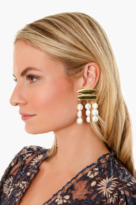 The Pearl Tala Earrings have three columns of pearls cascading from stunning gold hardware. This style makes for a subtle, yet unforgettable statement. Pair with everything from a cocktail dress to a chunky knit to elevate your look.
