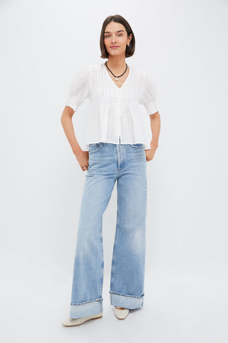The Zora top features an oversized sleeve with pleated bodice, deep v-neckline, ruffle hem and cropped silhouette. The perfect blouse to throw on with jeans and flats, swap out your everyday white tee-shirt for this elevated top!