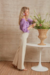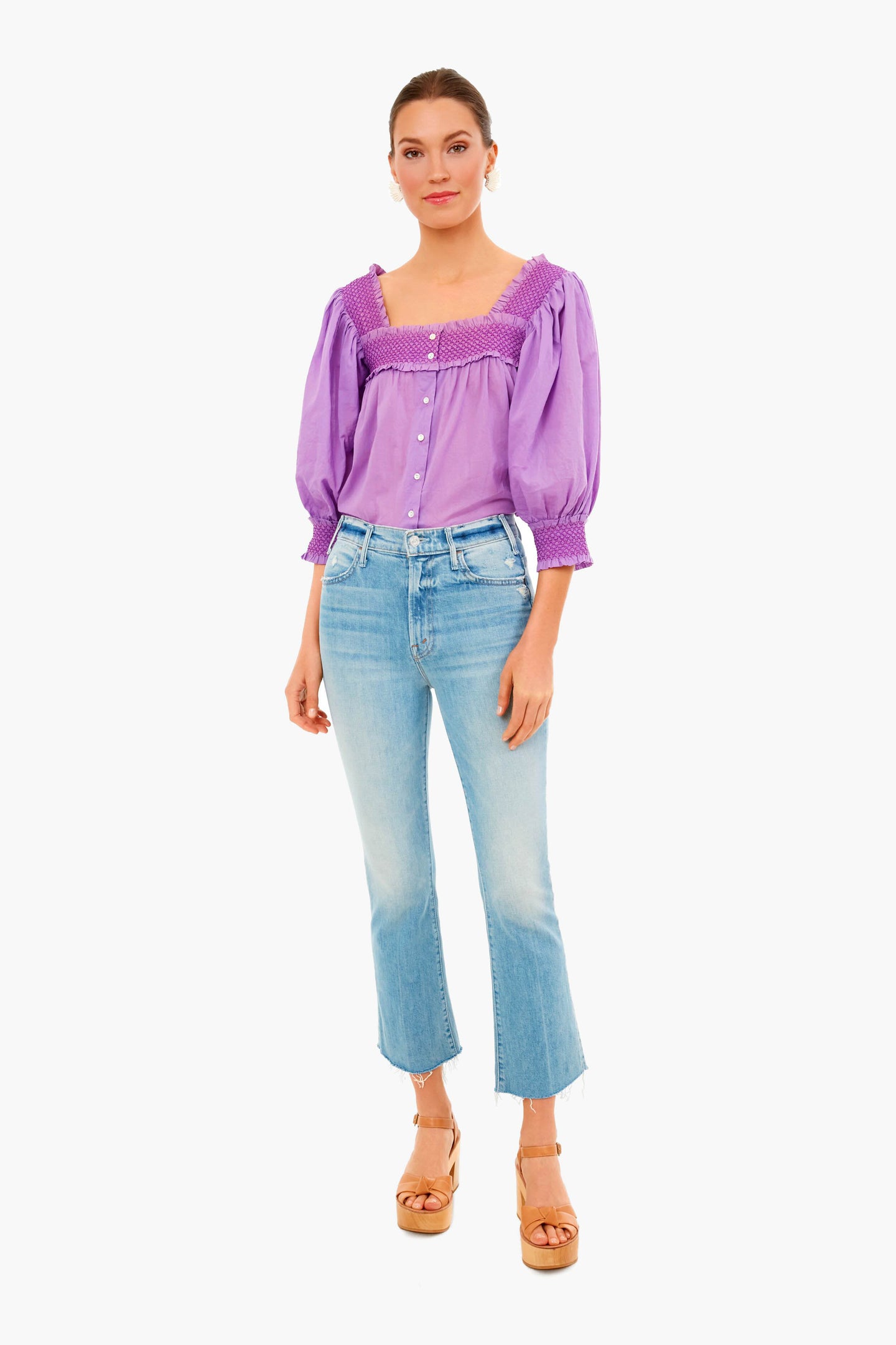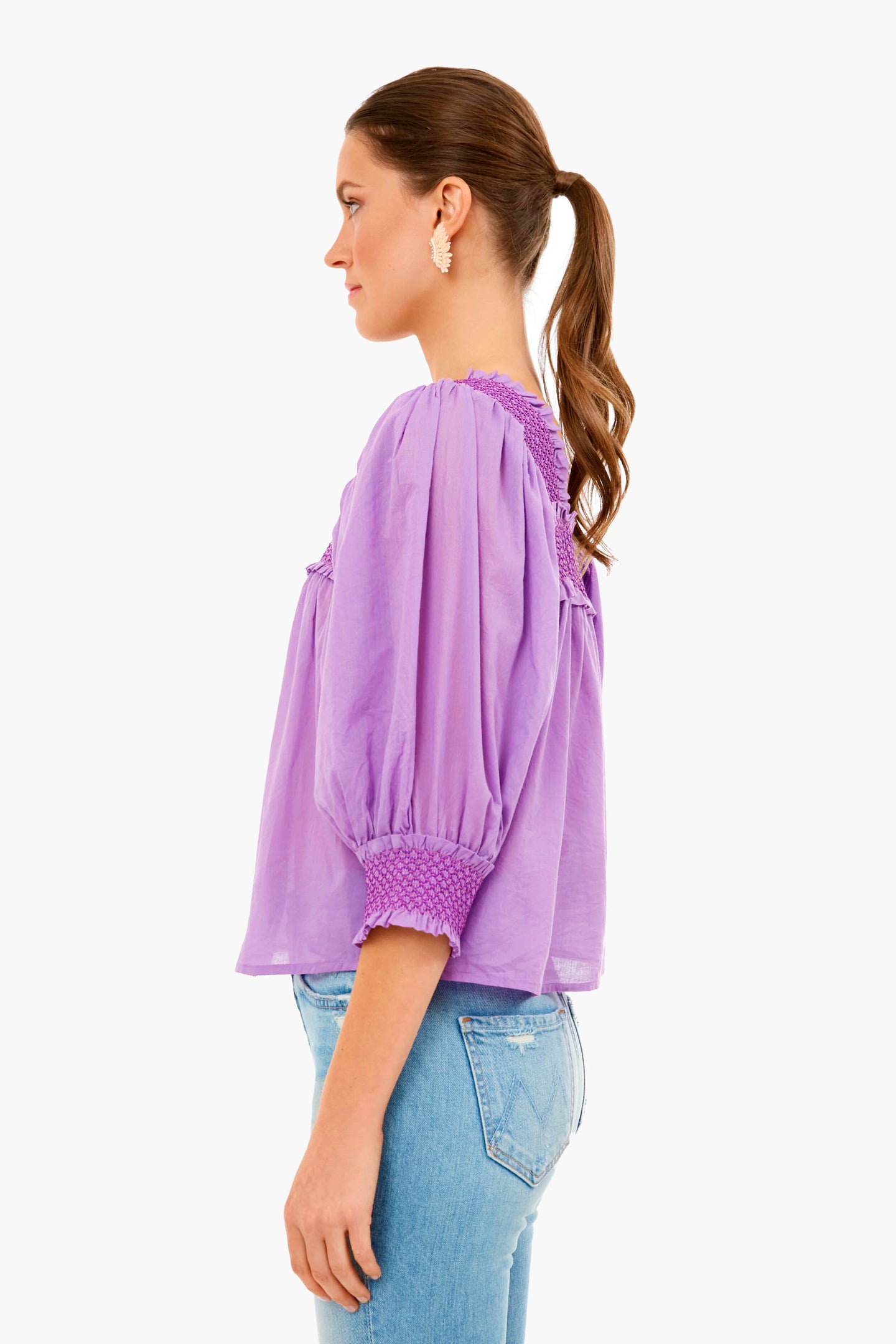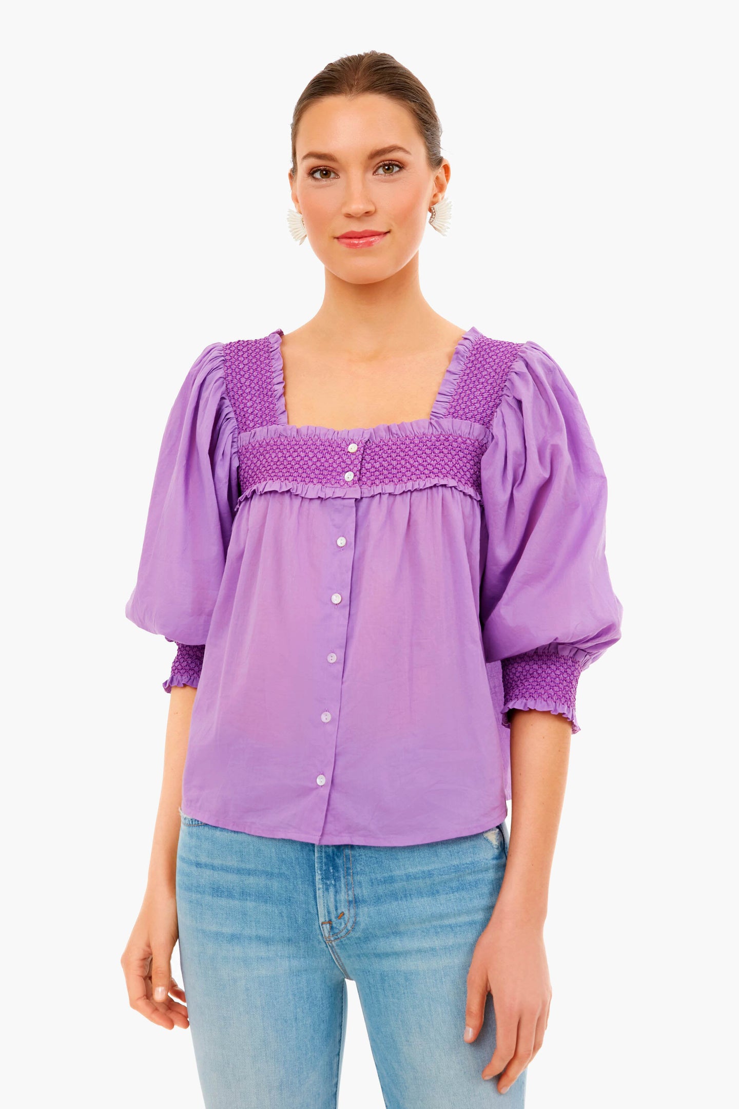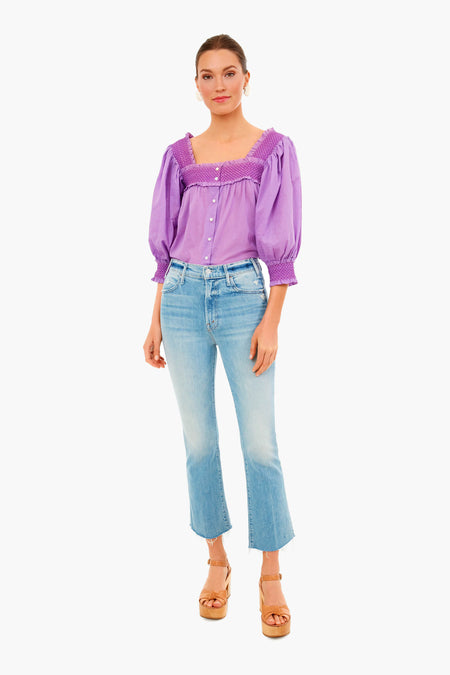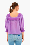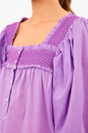 The Perrine Blouse is made from a vibrant purple cotton voile. Featuring a boxy fit, mother-of-pearl buttons, and smocked details at the neckline, back, and cuffs- this style is fresh and feminine. Add wide leg denim and leather sandals for a vintage-inspired, forever-chic look.