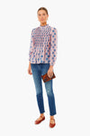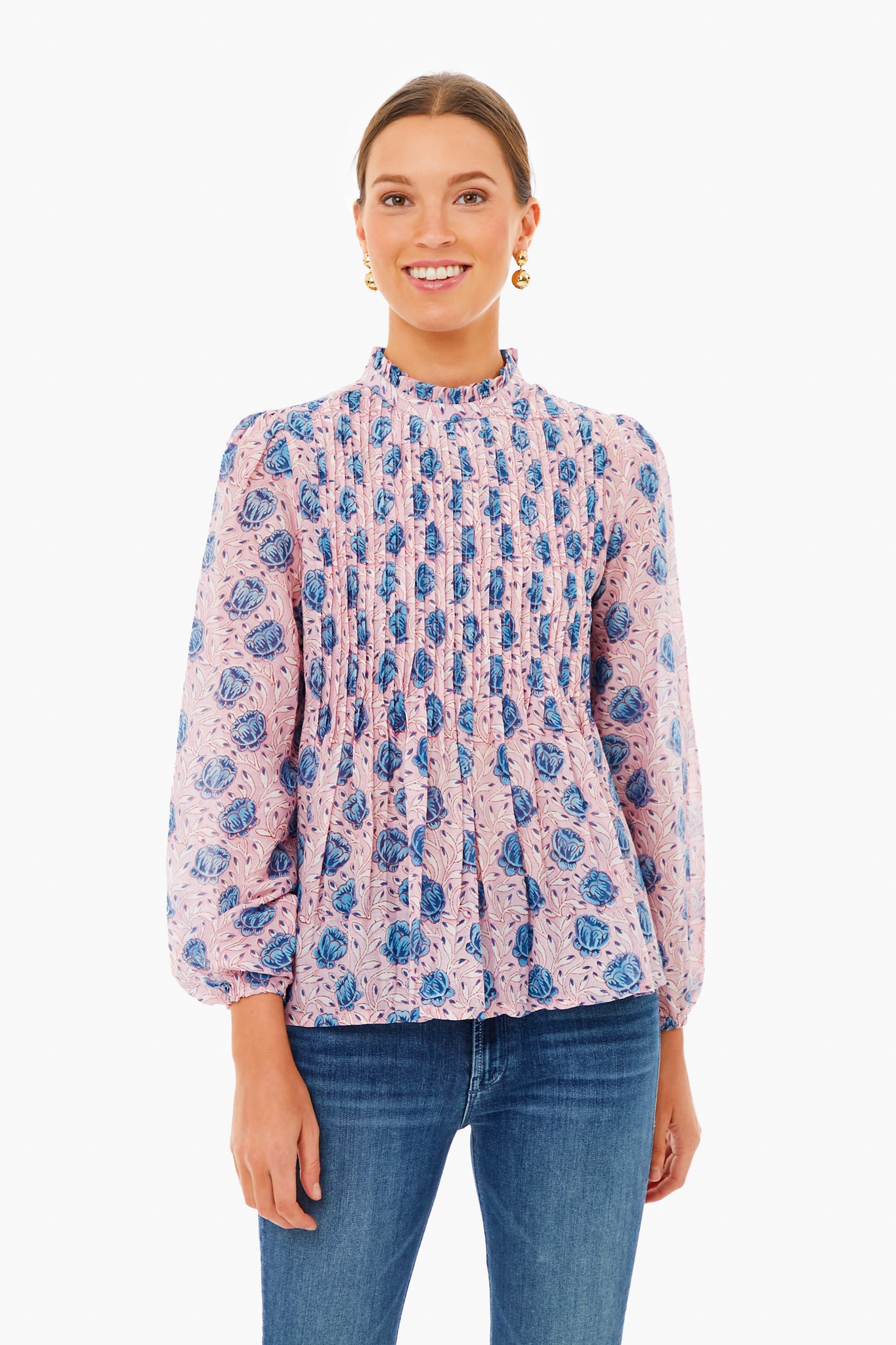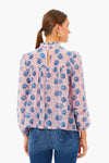This puff sleeve top features a high neck, pintuck bodice, and keyhole button closure at the back. With a bold print throughout, this style is whimsical and romantic. Pair with gold earrings and denim for a fall-inspired look.