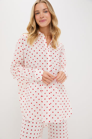 A woman wears a white, oversized fit POSSE shirt and matching pants, both featuring a red polka dot pattern.