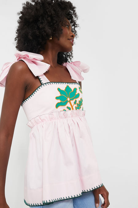 A bestseller, the Pink and Green Perla Top includes a gathered empire waist that is fitted around the bodice and goes into a flowy A-line body. Fun details include a vibrant floral design on the front chest with embroidered trim and contrast edges along the neckline, straps, and hem. The self-tie sleeves add an adorable touch- simply pair with denim or a skirt and sandals and you are ready for beachside strolls, weekend farmers markets, and sunny lunch dates!