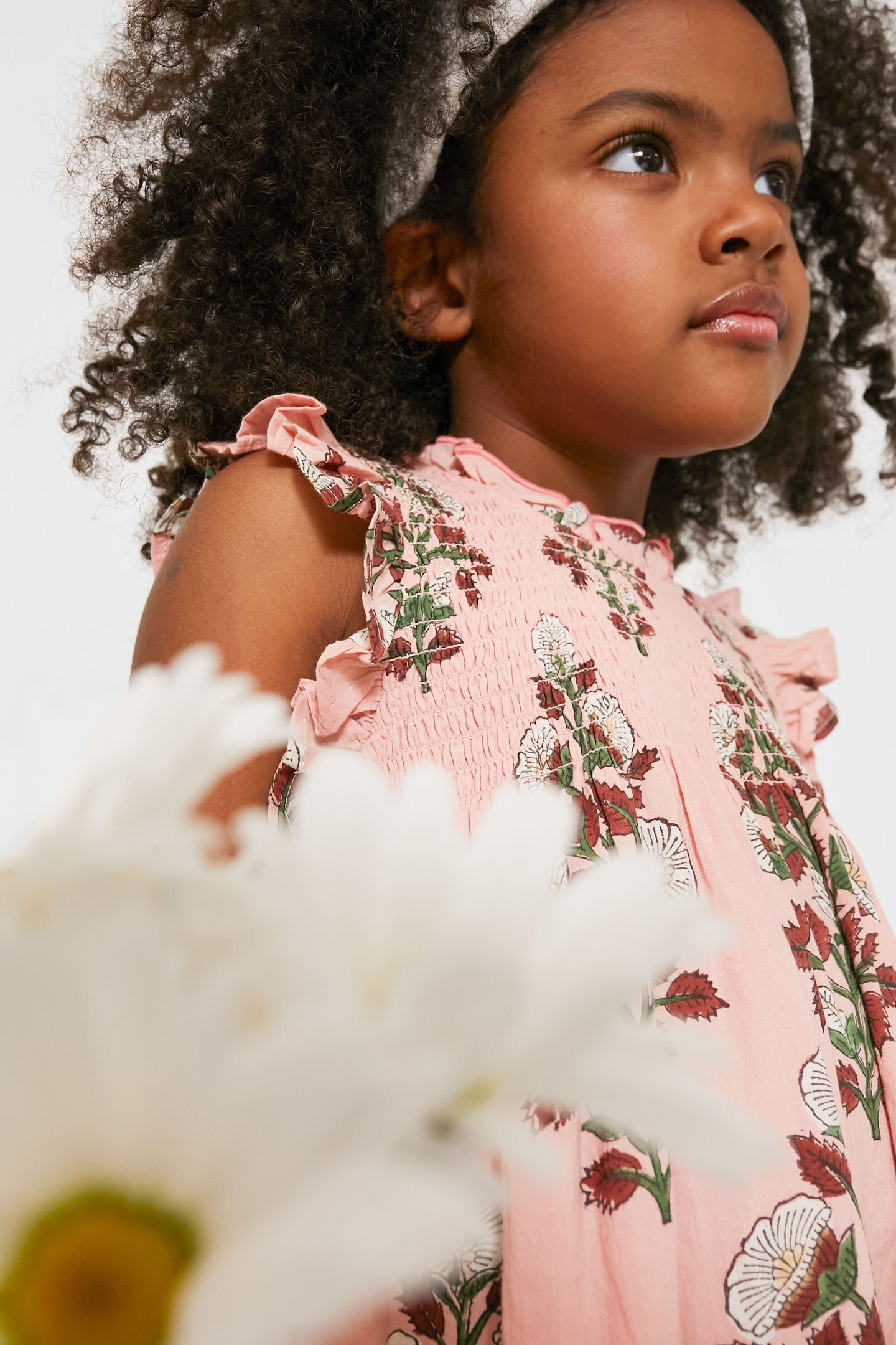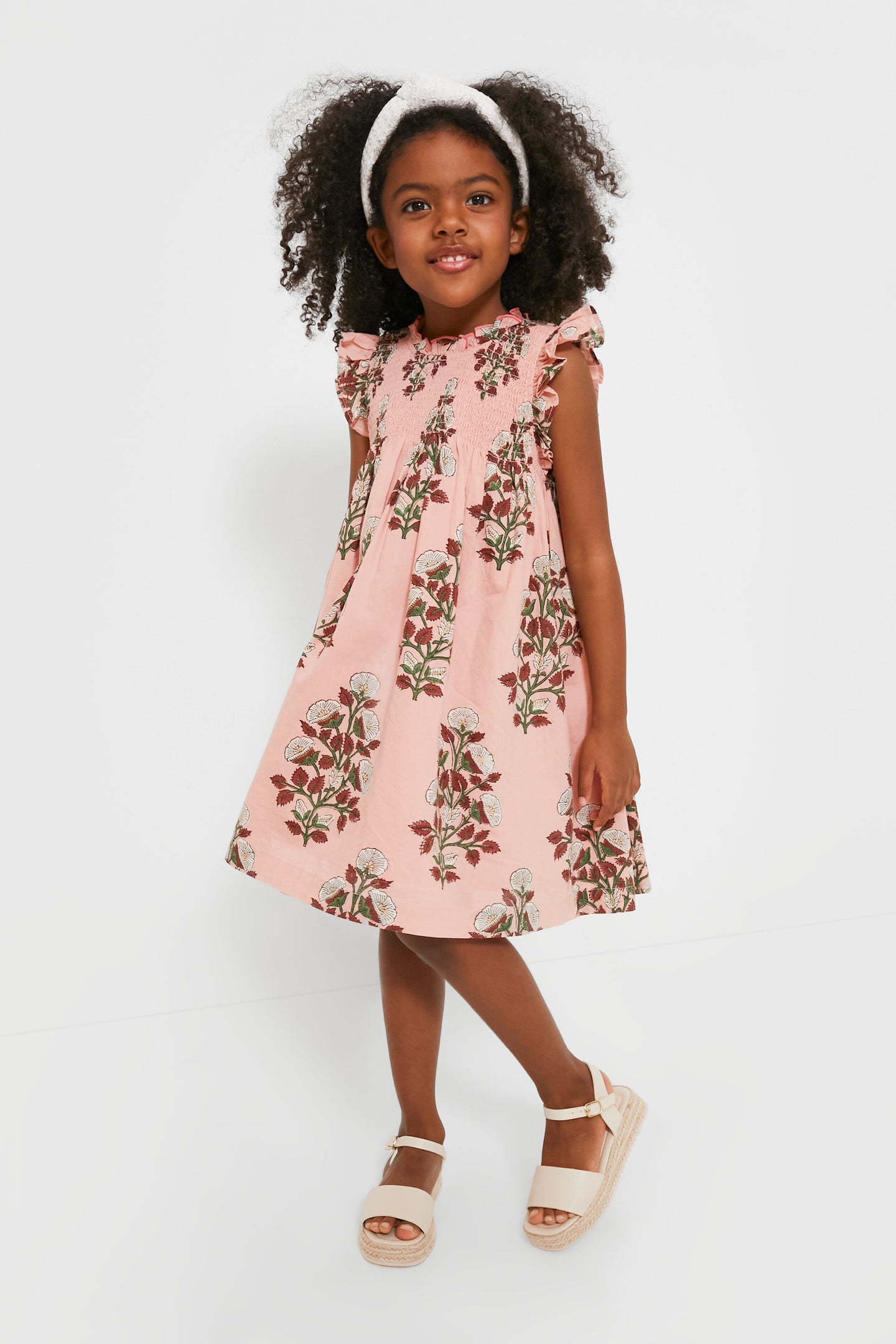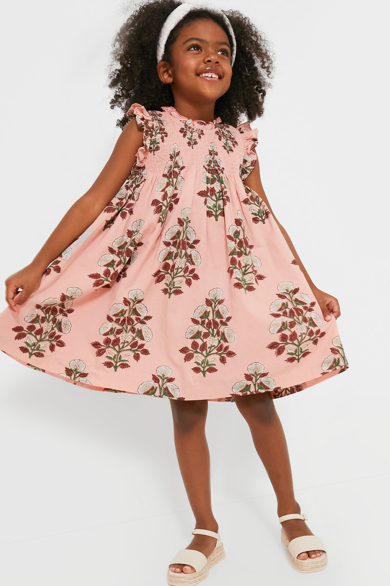 Pretty in Pink! Your little girl is about to look absolutely adorable in the Bouquet Floral Stevie Dress. A gorgeous spray of white blooms on a vibrant vine pops off the dusty pink ground, this flock favorite features a ruffle at the neckline and arm, smocking at the chest and an invisible zipper at back. Pair with a headband for Sunday brunches or picture day at school, and wear it with sandals for fun in the sun.