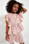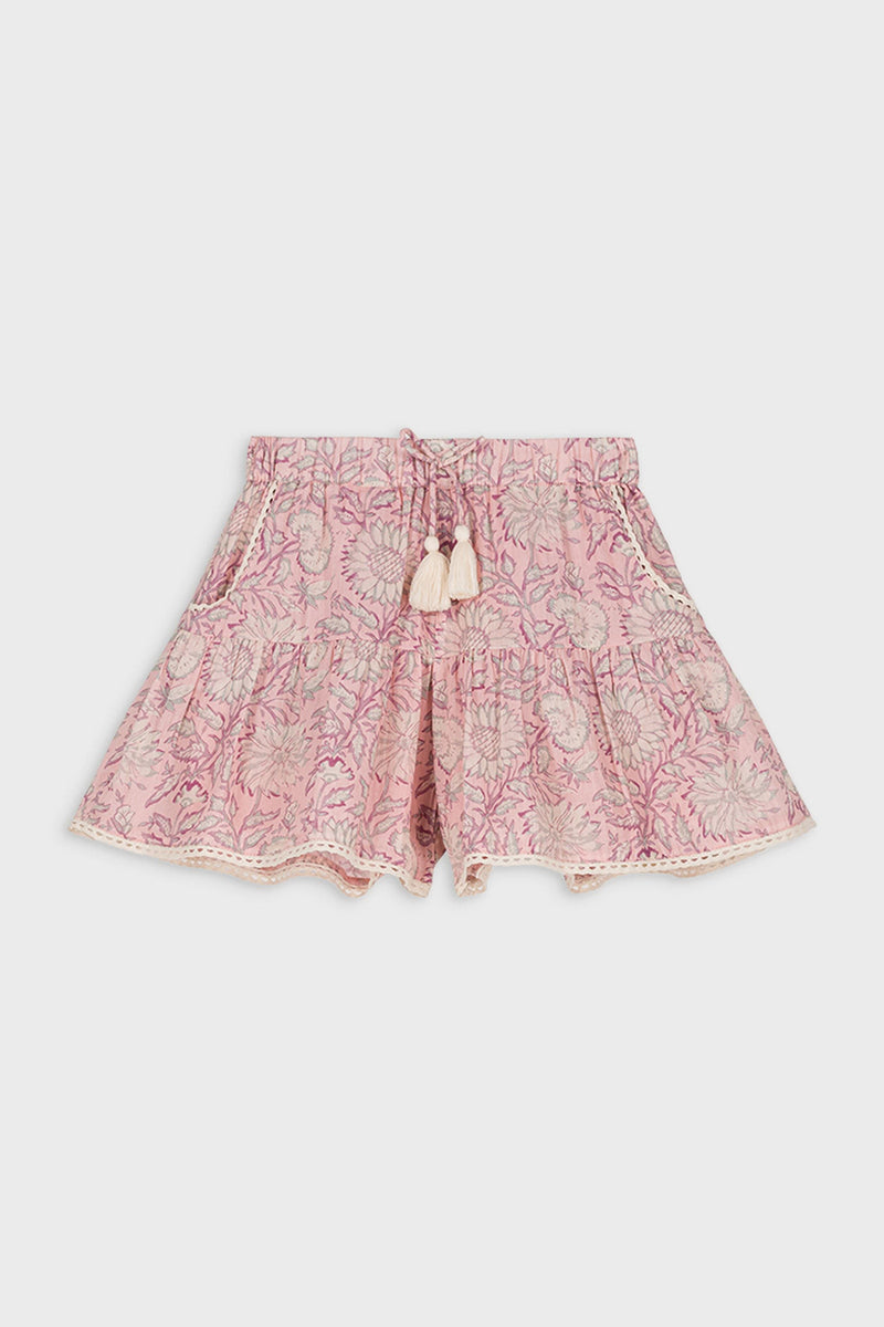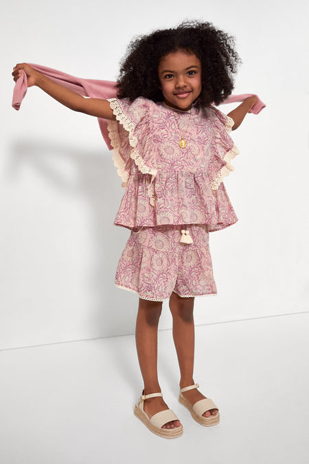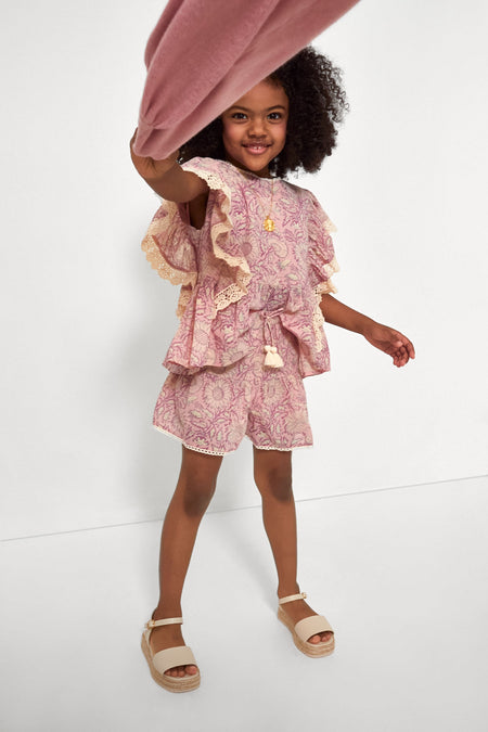 With the Pink Daisy Garden Alambra Shorts, your little one won't have any trouble finding some fun in the sun. Designed with a nicely ruffled and gathered cut, it boasts a charming skirt look with a comfort of shorts. Finished with lace trims and handmade tassels, this cute-as-can-be style will let your kiddo’s legs freely skip across the fields. Pair it with a matching Pink Daisy Garden Ines Blouse for a cute matching ‘fit for your little fashionista.